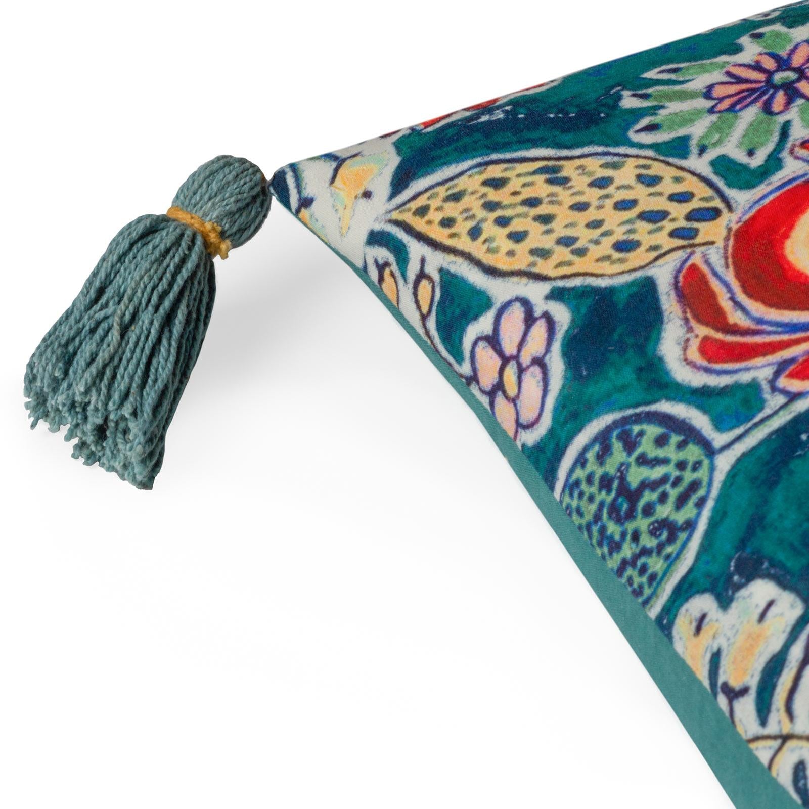 Transform your living space with this stunning collection of cushion covers, featuring bright, swirling abstract florals in a vibrant palette of primary colours such as red, yellow, blue, and green. Set against a rich, deep-toned teal background, these designs embody a bold and adventurous spirit, perfect for adding a splash of dramatic colour to any modern luxe interior. Each cushion cover is elegantly finished with unique loop corner tassels, crafted from contrasting yarns that enhance the eye-catching aesthetic.