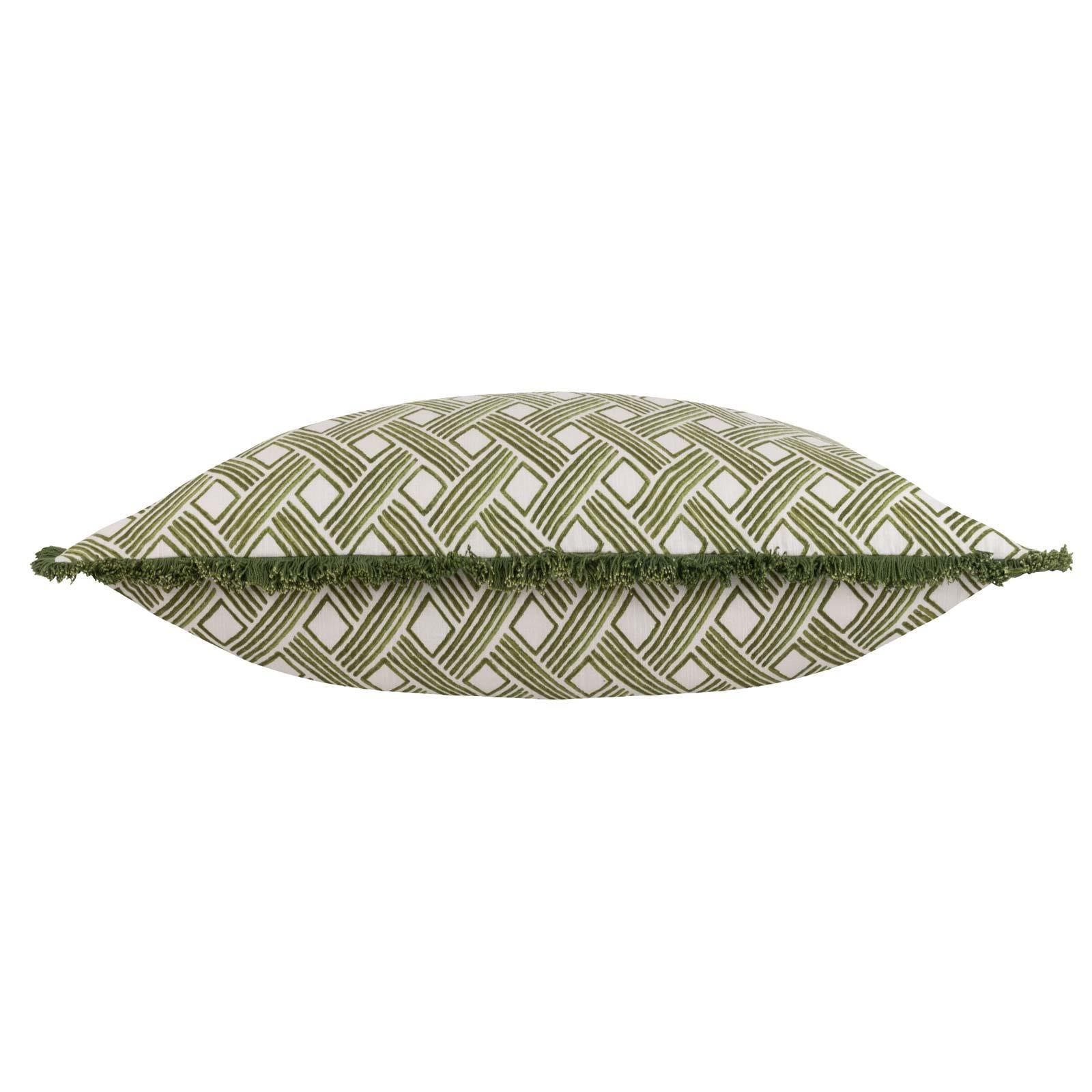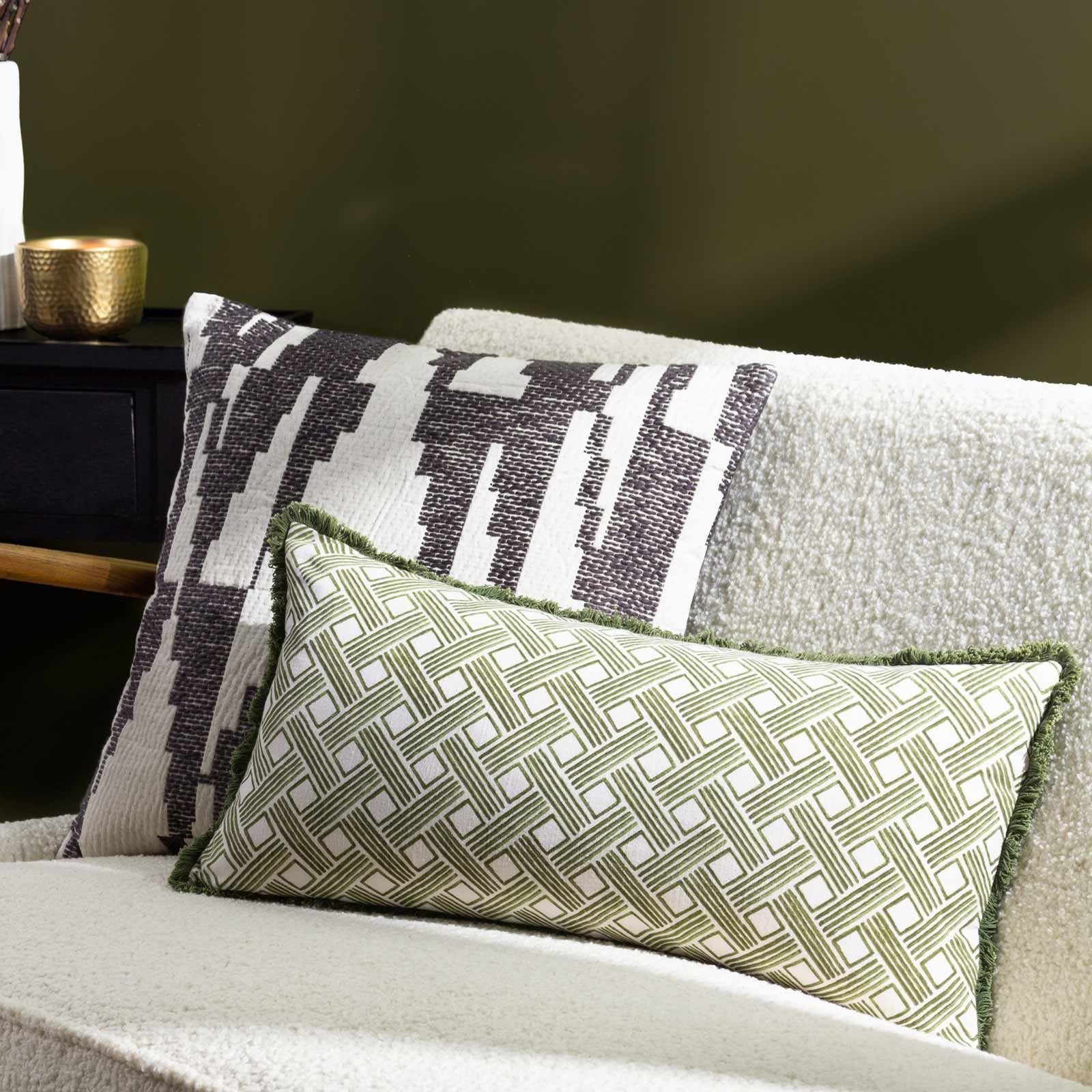 Inspired by modern, minimalist art, the Alexa cushion is a softer alternative to geometric design. Featuring watercolour basket weave lines and a soft cotton fringed trim in earthy green tones. This design will add warming, relaxing colour to a neutral interior.