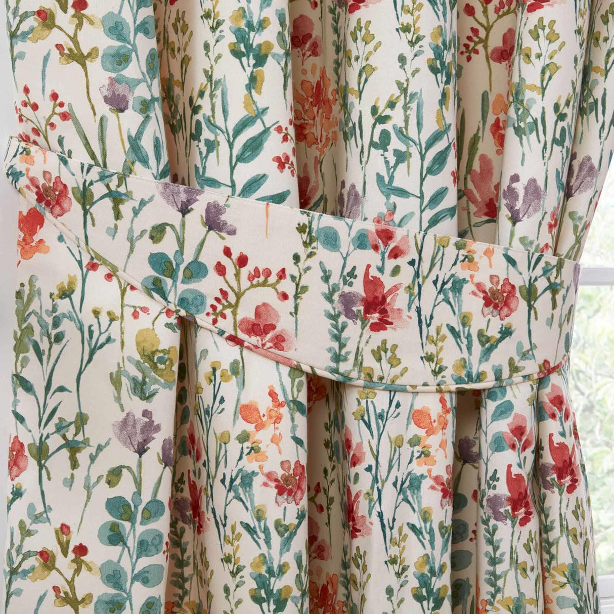 A beautifully designed watercolour floral tie back pair in shades of pink and greens printed on a warm ivory background.