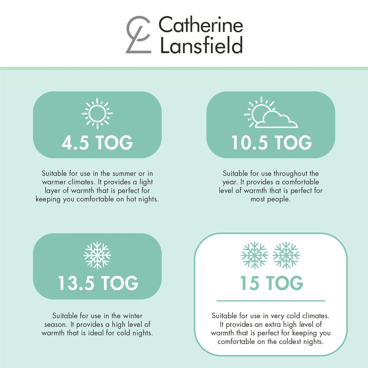 - 15 tog suitable for use in the colder seasons, providing a higher level of warmth
