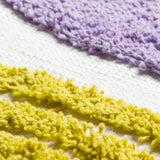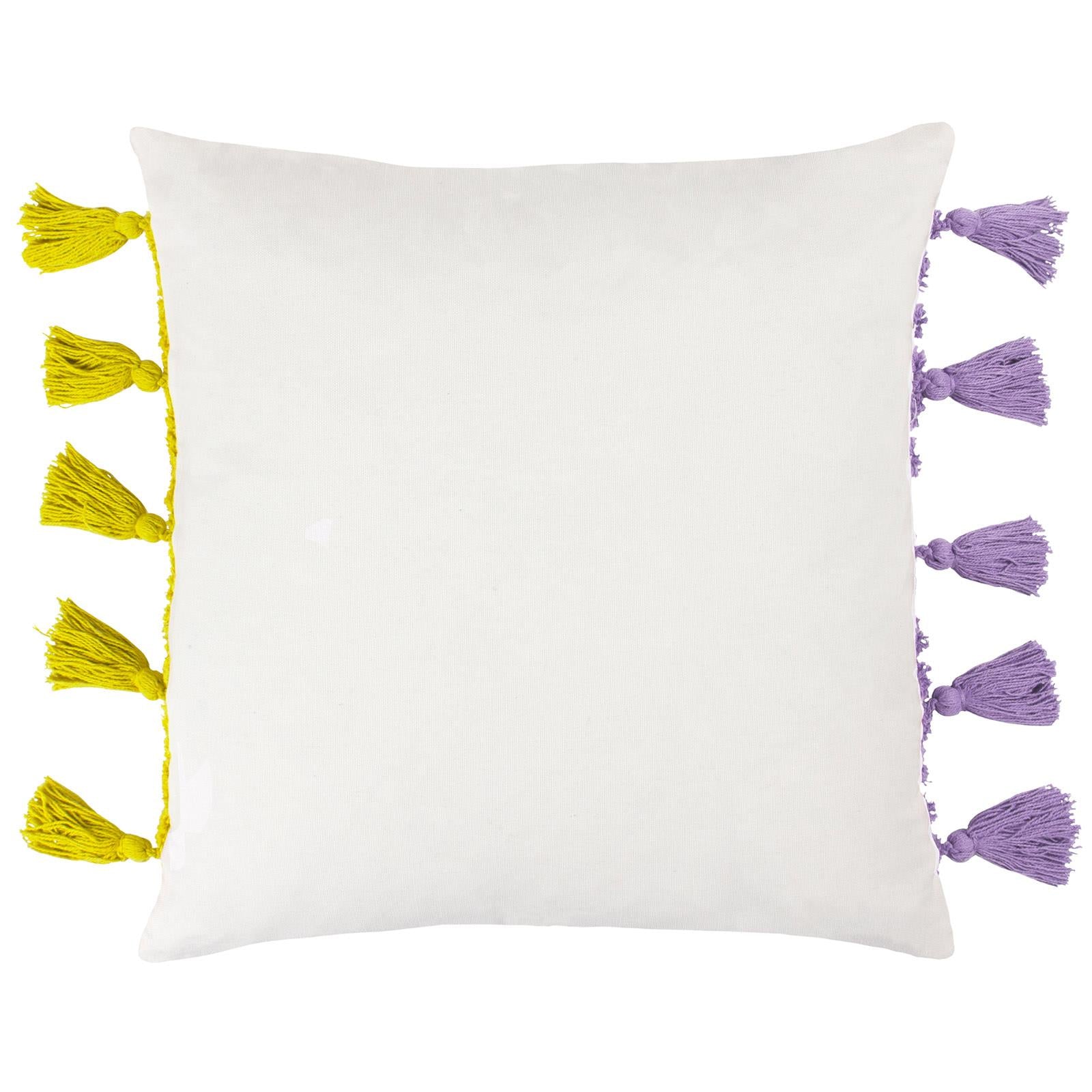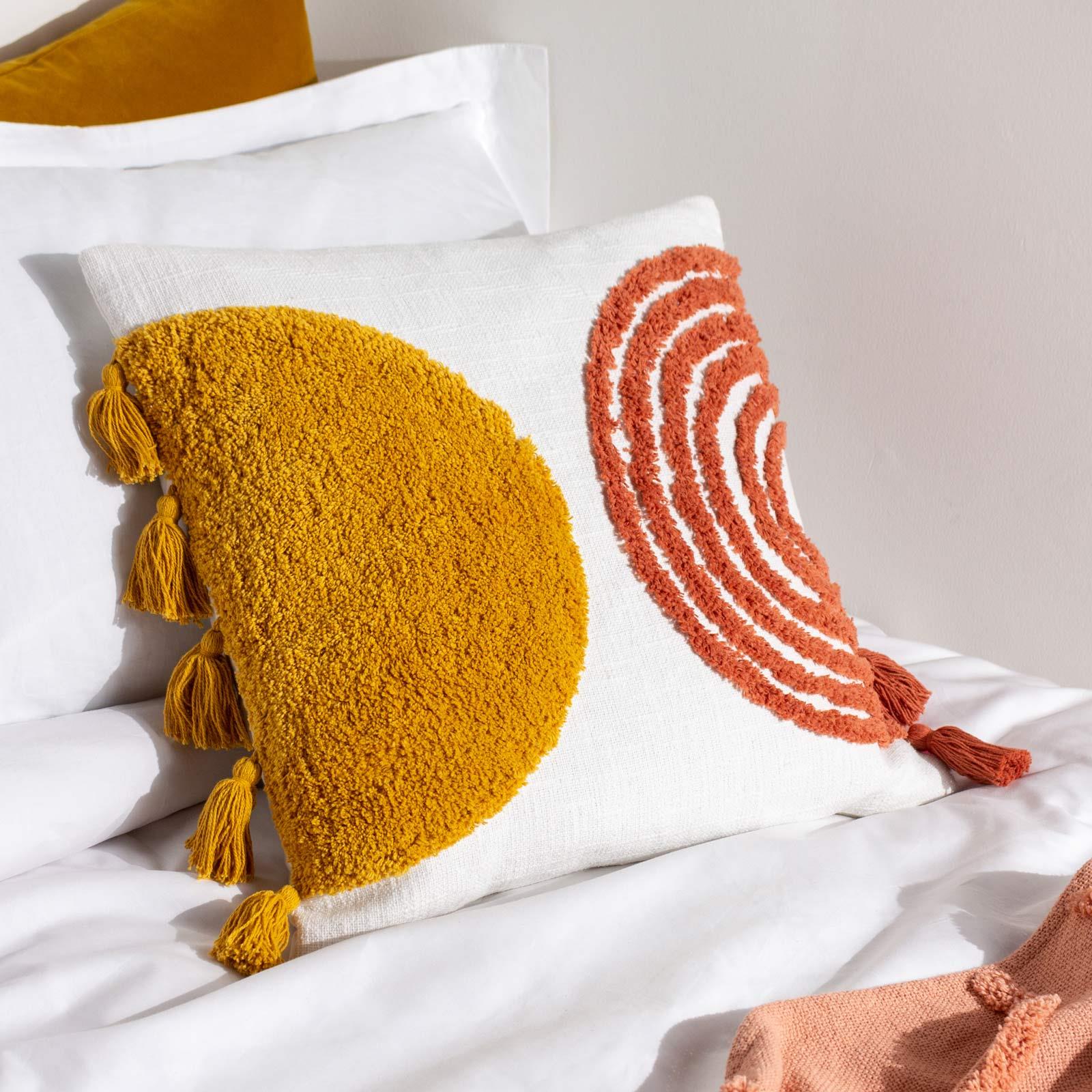 Brighten up your living space with this fun and vibrant cushion cover that brings a burst of personality to any room. Featuring a unique design with a semi-circle of soft, tufted cotton on one side and a funky tufted rainbow on the other, this cushion cover instantly adds life to your furnishings. The playful aesthetic is enhanced by five chunky tassels on each side, a stylish knife edge trim, and a convenient zip fastening, making it an ideal addition for layering on your bed or sofa.