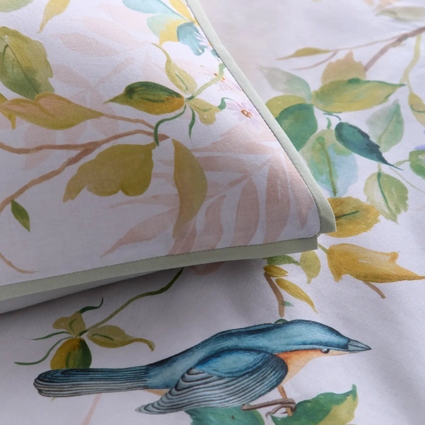 Indulge in the tranquil beauty of the Appletree duvet cover set, Arianna. This exquisite set features a stunning country garden foliage print that delicately adorns a luxurious 200 thread count cotton base in natural hues, whispering tales of elegance and sophistication into your bedroom decor. The intricate design captures the essence of a serene garden, bringing a touch of nature indoors. As you explore further, the reverse reveals a classic plain dye, exuding timeless charm and versatility, allowing you to effortlessly switch up your bedroom aesthetic.