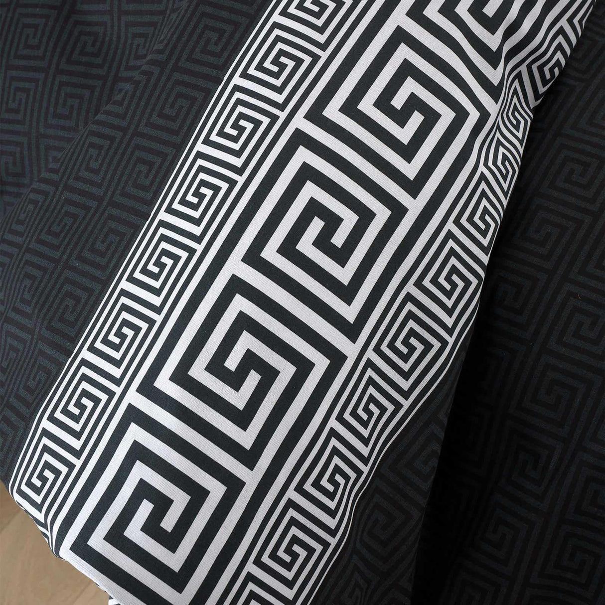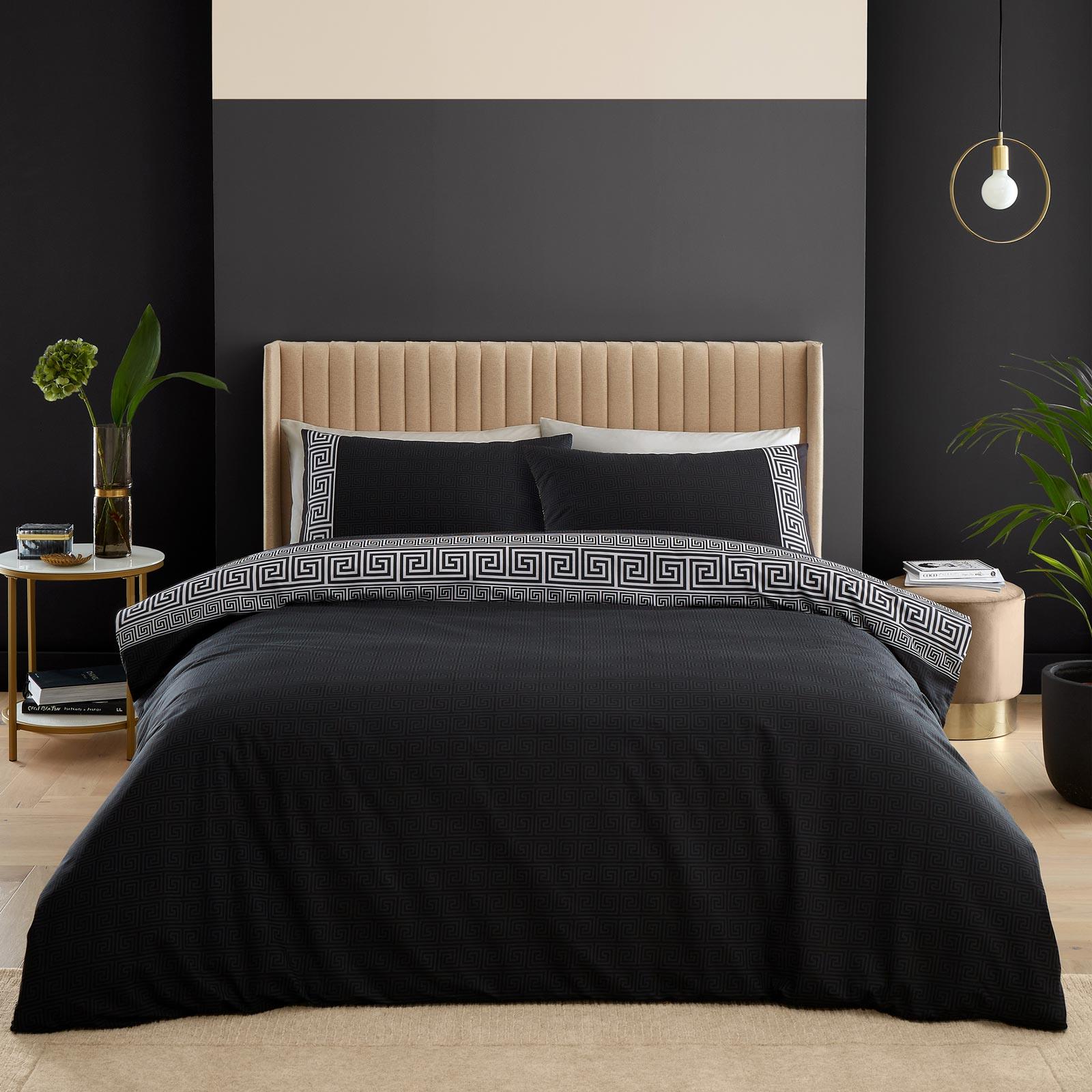 Make a statement in your bedroom with this timeless linear Greek key motif bedding. The stylish repeating pattern, coloured in a contrasting grey takes centre stage against a dramatic black backdrop. Fully reversible with a repeated geometric key motif and created from recycled polyester and soft responsibly sourced cotton, blended together for everyday use.