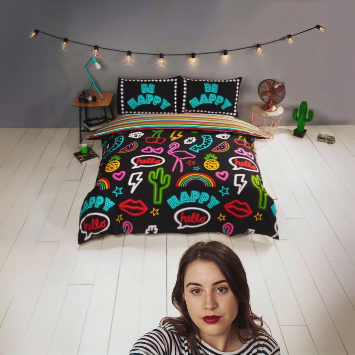 Bright and funky reversible duvet covers with a neon print design and co-ordinating stripe reverse. Featuring on-trend cactus, flamingo and pineapple motifs, this contemporary print would work well throughout any bedroom.