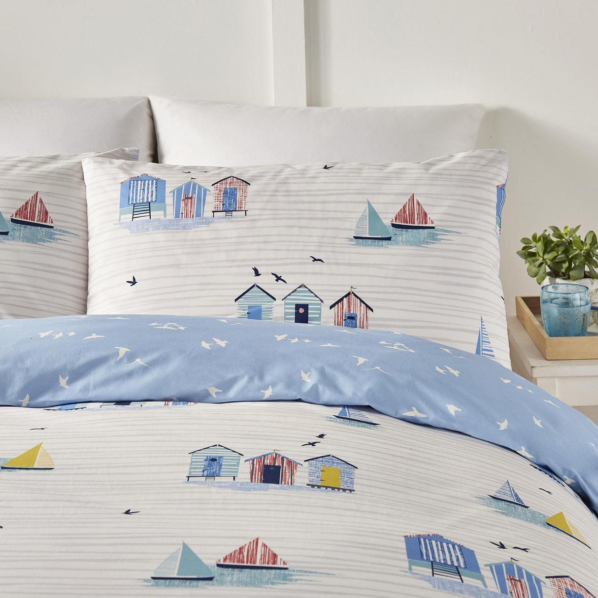 Take a deep breath of salty seaside air and get ready to relax where the seagulls play. This coastal-themed duvet cover set features a charming parade of beautiful beach huts, making it the perfect addition to any bedroom. Crafted from easy-care polycotton, it ensures a soft and comfortable place to drift off to sleep after a long day.