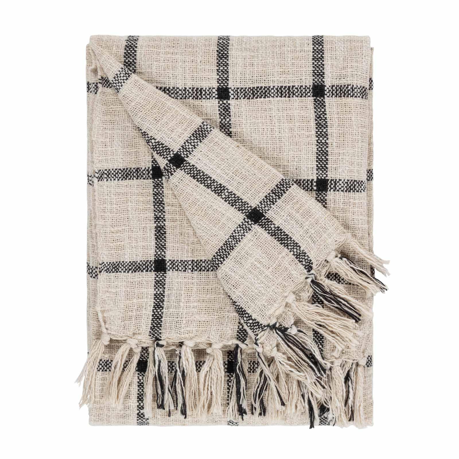 - Featuring a contrasting check weave in relaxed, rustic hues