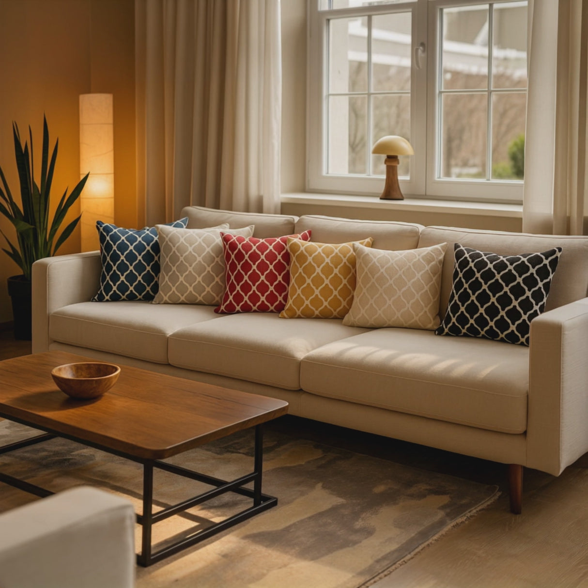 • Mix sizes: layer larger 22–24" cushions at the back with smaller ones in front for depth.