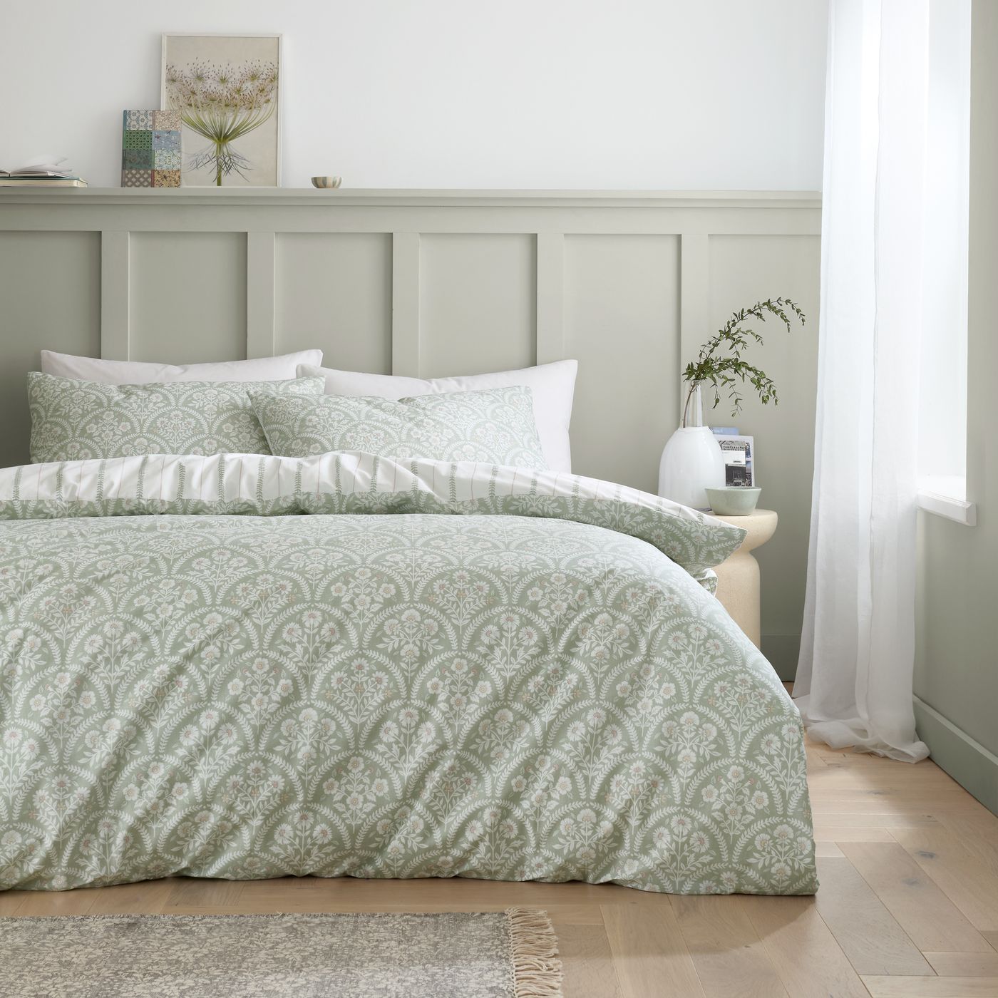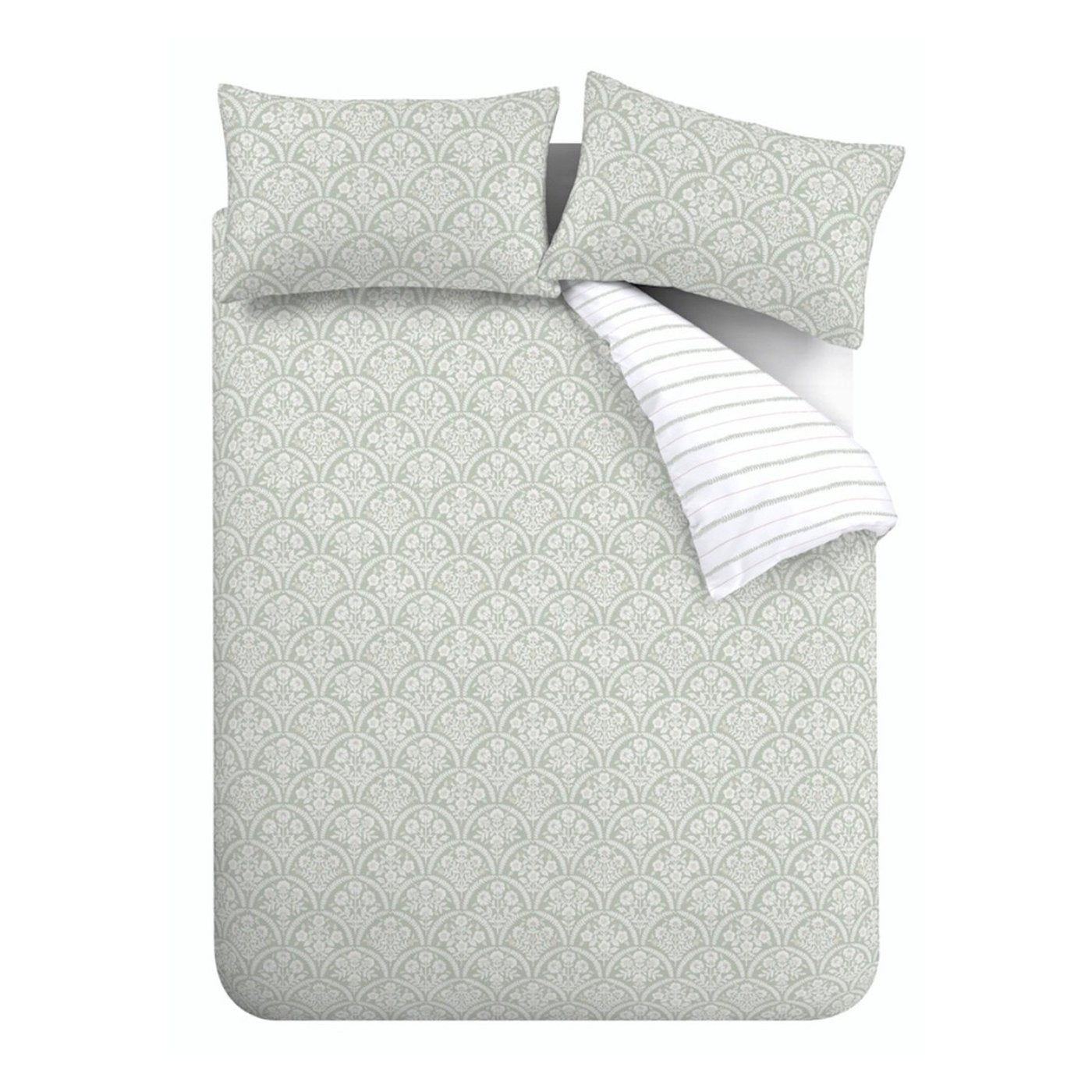 Delicate scallop motifs surround beautiful flora creating a calming, serene bedroom ambiance. Fully reversible with a complementary stripe reverse, offering a versatile and luxurious aesthetic. Experience the softness of premium cotton, in 200 thread count percale, against your skin as you immerse yourself in the tranquil charm.