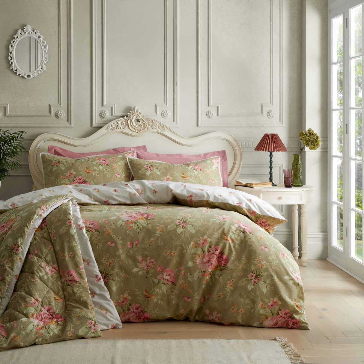 Envelop yourself in the romance of yesteryear with this exquisite set that features a delicate floral print set against a soothing olive backdrop, finished with an elegant lace trim for a touch of refined grace. Created from easy-care recycled polyester and soft responsibly sourced cotton, blended for everyday use.