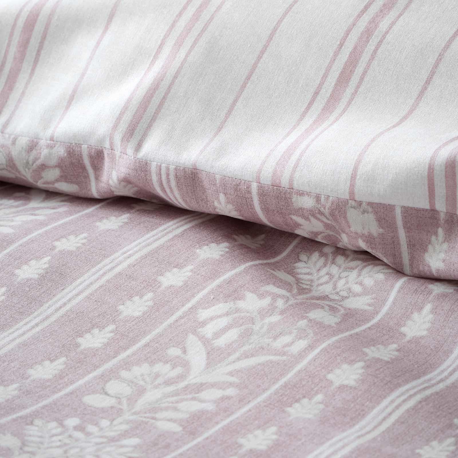 Turn your bedroom into a sanctuary of classic beauty and modern luxury. The delicate stripes create a sense of sophistication, while the inserted fancy florals add a touch of opulence to the design. With elegantly piped pillowcases for a refined finish that complements the overall look, making your bed a true centrepiece to your room. Created from easy-care recycled polyester and soft responsibly sourced cotton, blended for everyday use.