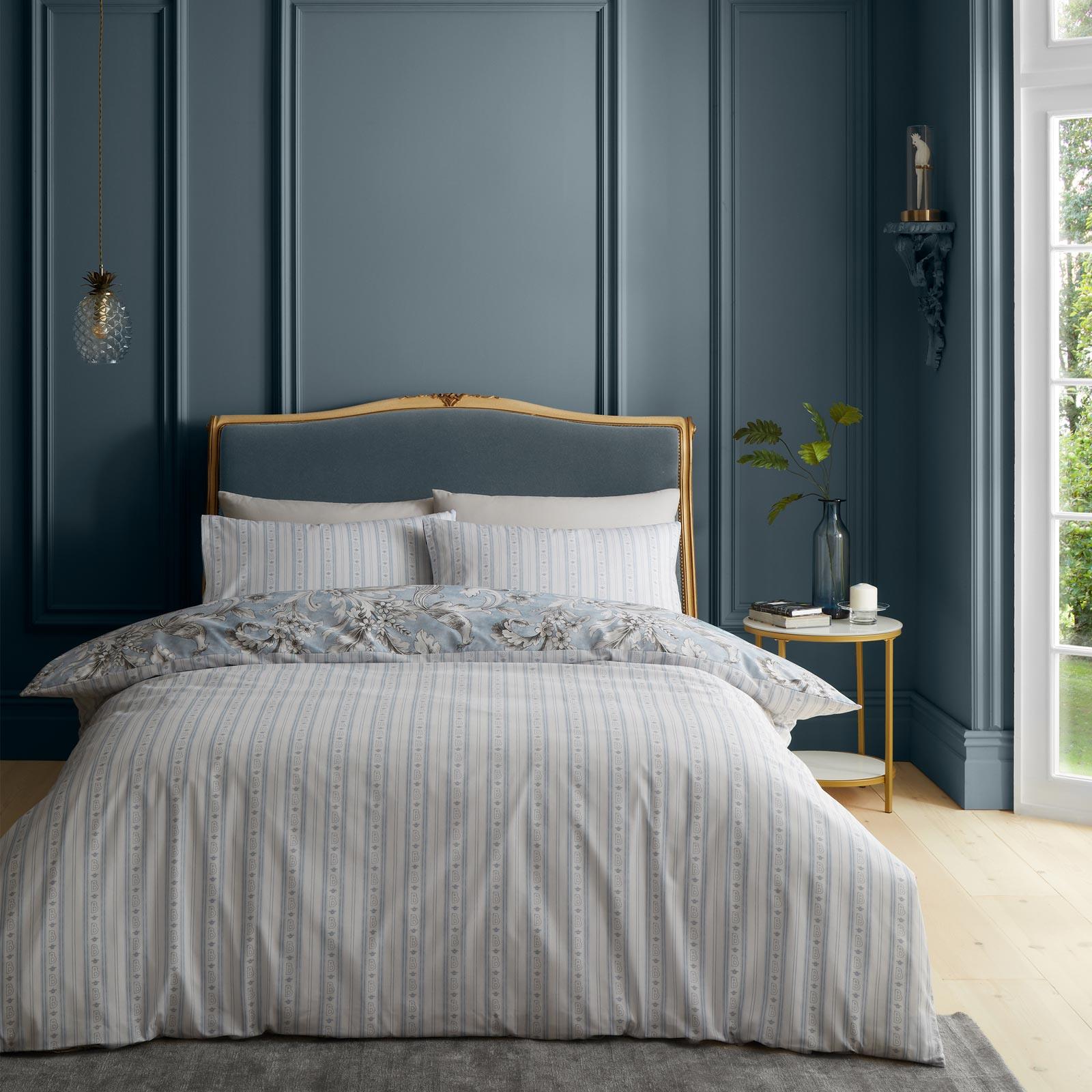Give your room a touch of soft and calming regency decadence with this hand drawn flower and bird's bed linen set. Fully reversible with the iconic Bridgerton 'B' and buzzing bee encased in a classic stripe, offering effortless interchangeable styling. Created from easy-care recycled polyester and soft responsibly sourced cotton, blended together for everyday use.