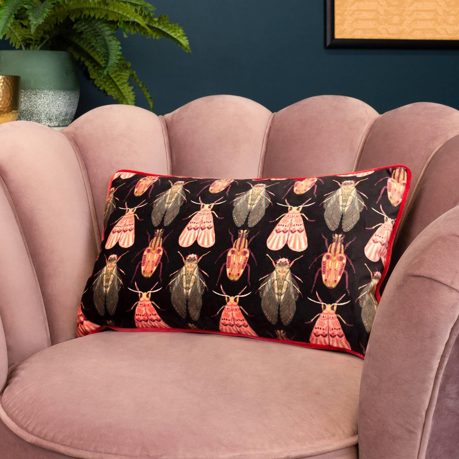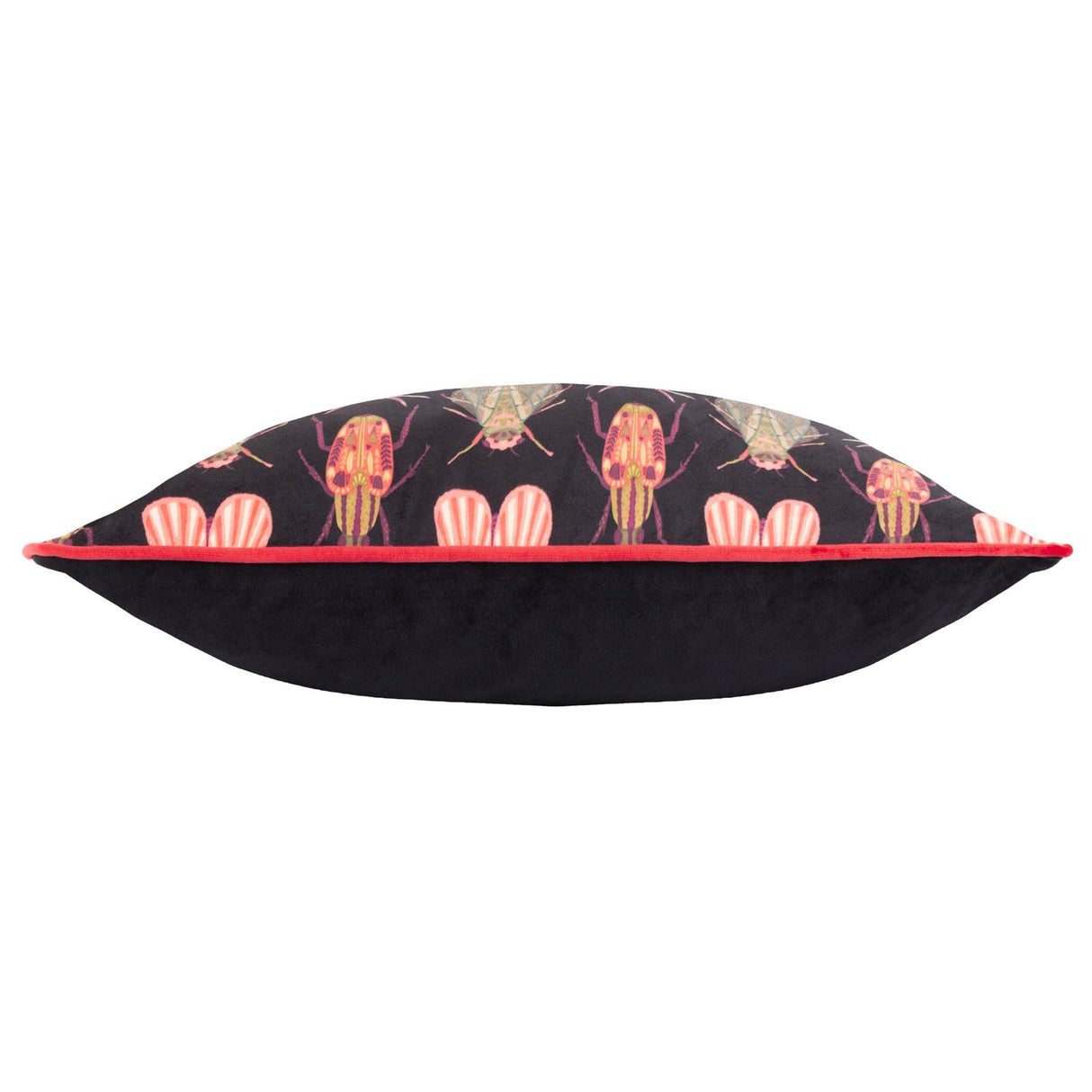 Bugs can be beautiful, as outlined by this fabulous design featuring several wonderfully intricately drawn flies, set on a jet black background. The detailed design is printed onto luxurious opulence velvet and finished with a woven piped border. This cushion cover will add a distinctive touch to your home furnishings.
