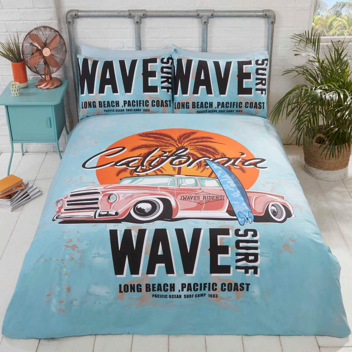 Our fresh and fun California quilt set with a vibrant surfer beach design. Bold photographic print with a small palm tree reverse.