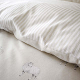 Get ready to drift off to dreamland surrounded by adorable sheep, nestled on a natural base. Fully reversible with a classic ticking stripe, offering a versatile option that complements any sleeping space. Crafted with soft and cosy responsibly sourced brushed Cotton, this bedlinen promises to keep you warm and comfortable throughout the night.