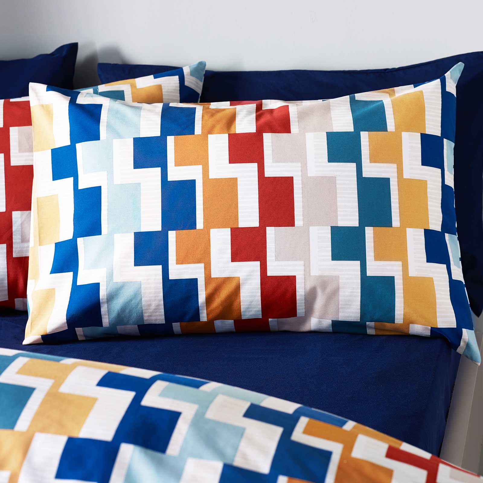 Bring a vibrant, modern touch to your bedroom with this bold geometric bedding set. Featuring a striking pattern of interlocking shapes, this design adds a playful yet sophisticated feel to any space. The fully reversible feature gives you two stylish looks in one, allowing you to switch between the eye-catching primary side and a more subtle, complementary pattern.