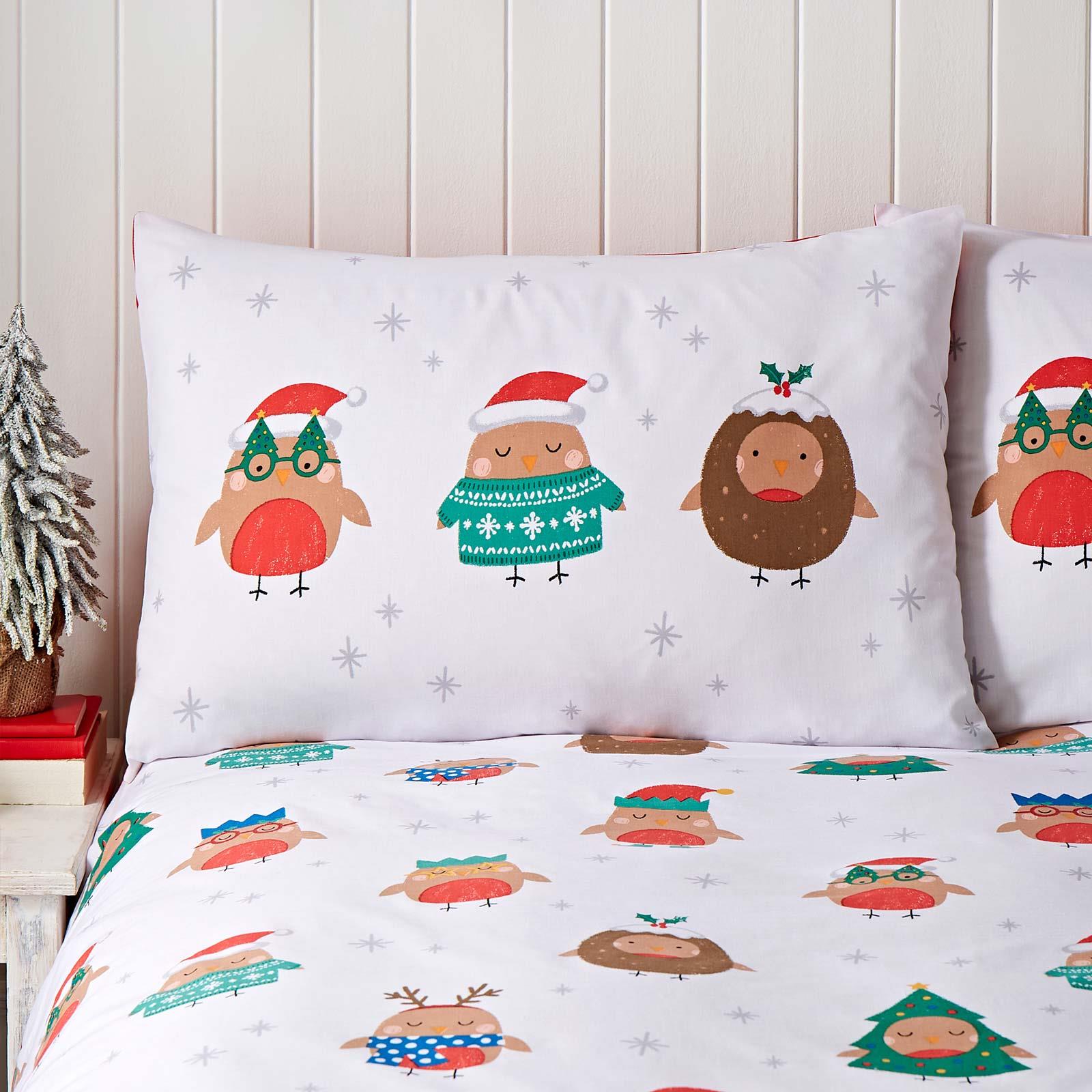 These stylish robins are dressed for the season, bringing a touch of festive fun to your sleeping space. Fully reversible, offering two looks in one. Flip between pure white and vibrant red sides to suit your seasonal style. Created from easy-care recycled polyester and soft responsibly sourced cotton, perfect for everyday use during the holiday season.