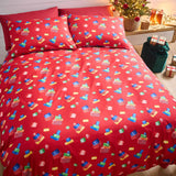 Step into a whimsical winter wonderland with this retro style Christmas bedding, featuring your favourite Santa Claus, reindeer and Christmas tree in a painterly style against a snowy white backdrop. Fully reversible in a bold red adorned with mini repeating present stacks offering two festive looks in one. Created from easy-care recycled polyester and soft responsibly sourced cotton, perfect for everyday use during the holiday season.