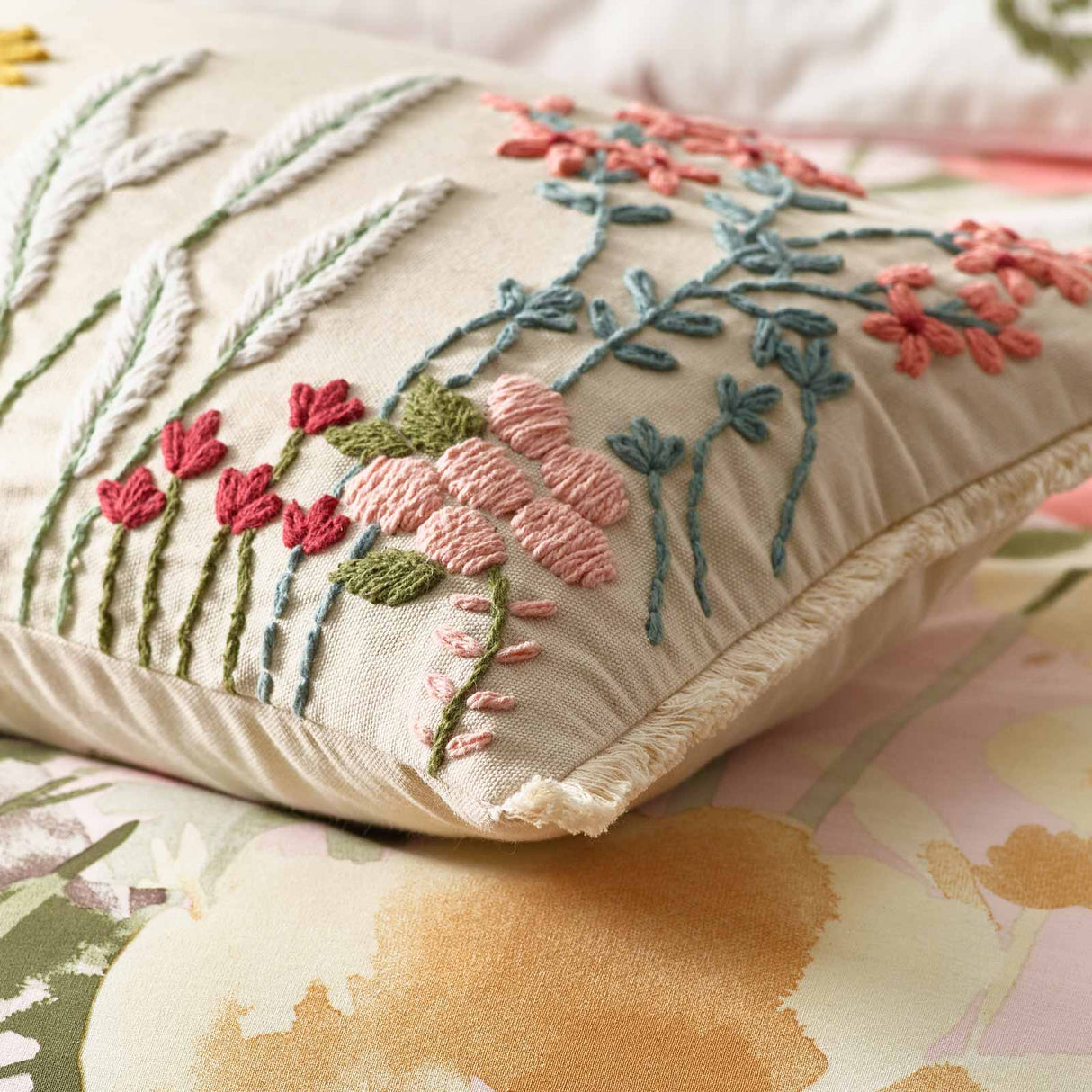 Bring the beauty of nature indoors with our embroidered scatter cushion, featuring a charming wildflower garden scene on a soft natural backdrop. The intricate embroidery showcases delicate flowers in vibrant colours, adding a touch of elegance to your décor.