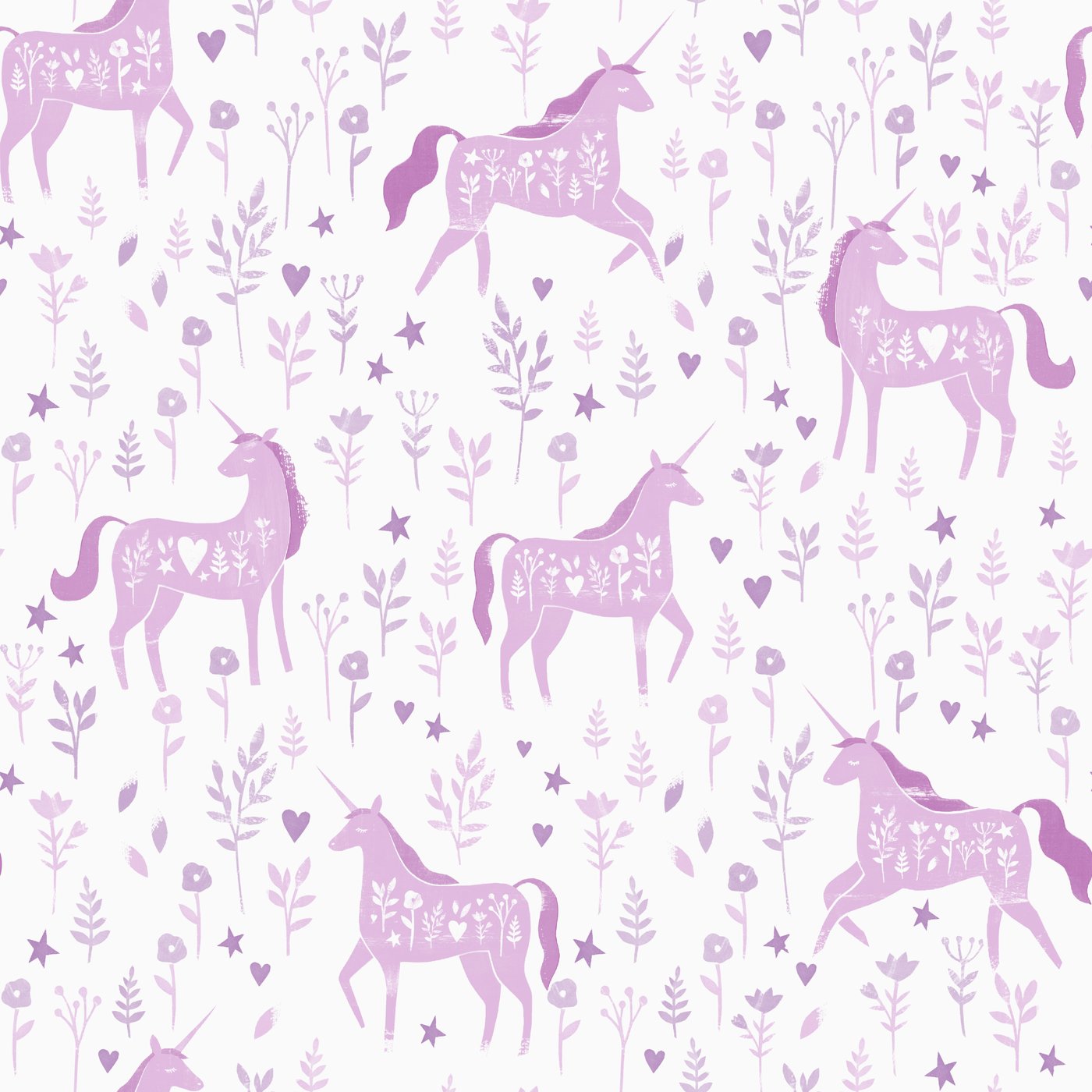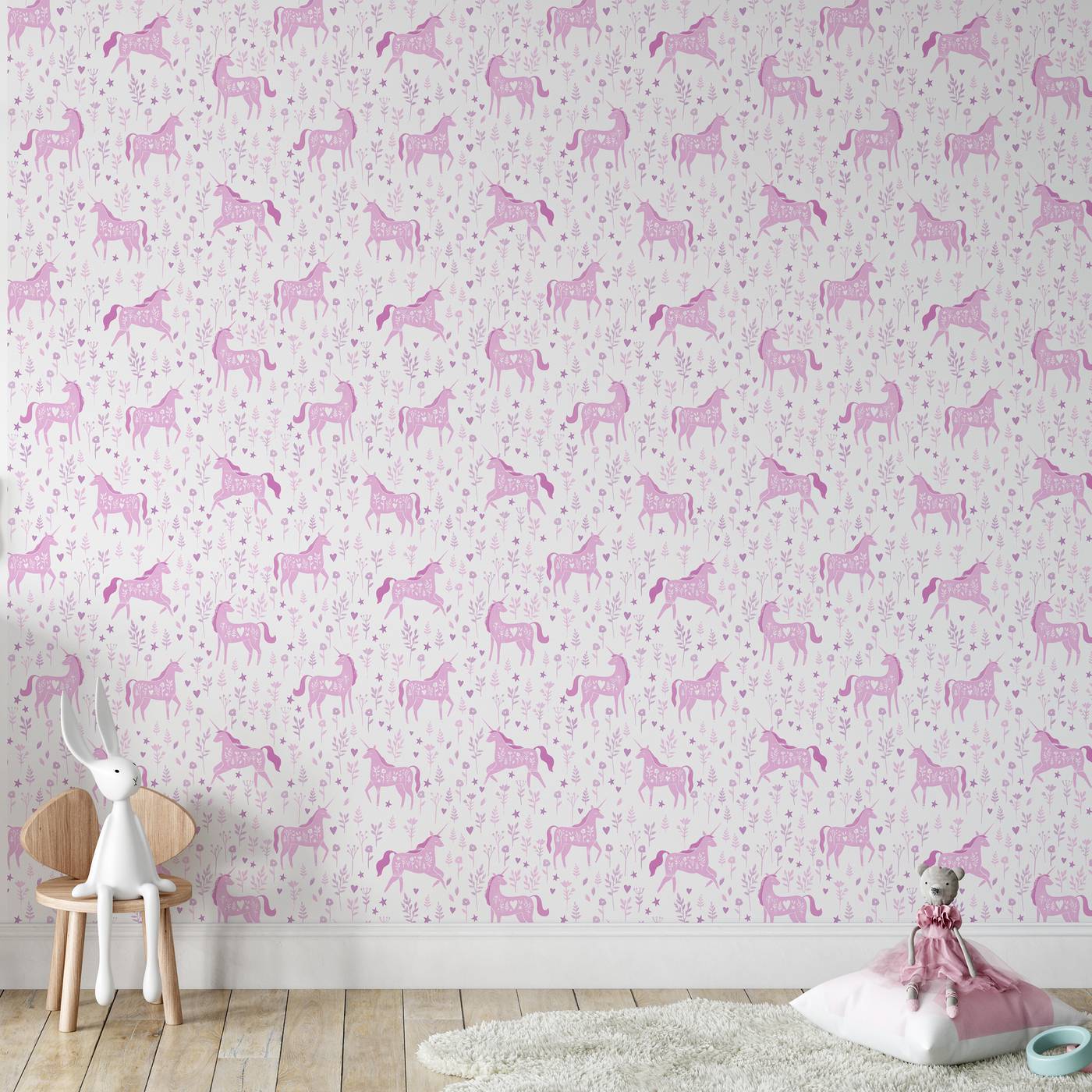 Bring a touch of magic to your little ones room with the enchanting folk unicorn wall paper, a delightful pattern of pink unicorns, flowers and leaves, cover the fresh white background.