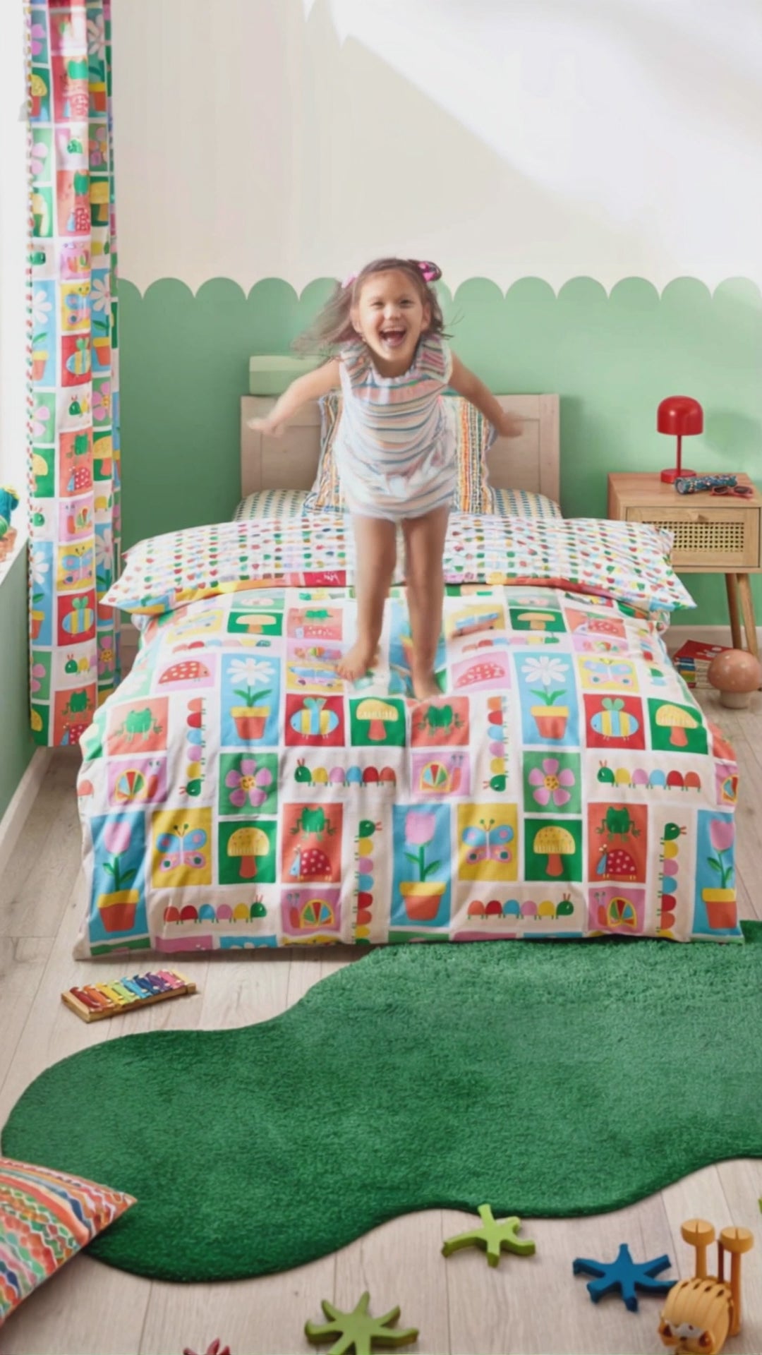 Brighten up your child’s bedroom with our garden-themed bedding set, showcasing a playful collage of flowers, bugs, and mushrooms in bold, cheerful colours. The reverse features a fun wiggly caterpillar pattern, offering a fresh, playful look. Created from easy-care recycled polyester and soft cotton, blended for everyday use.