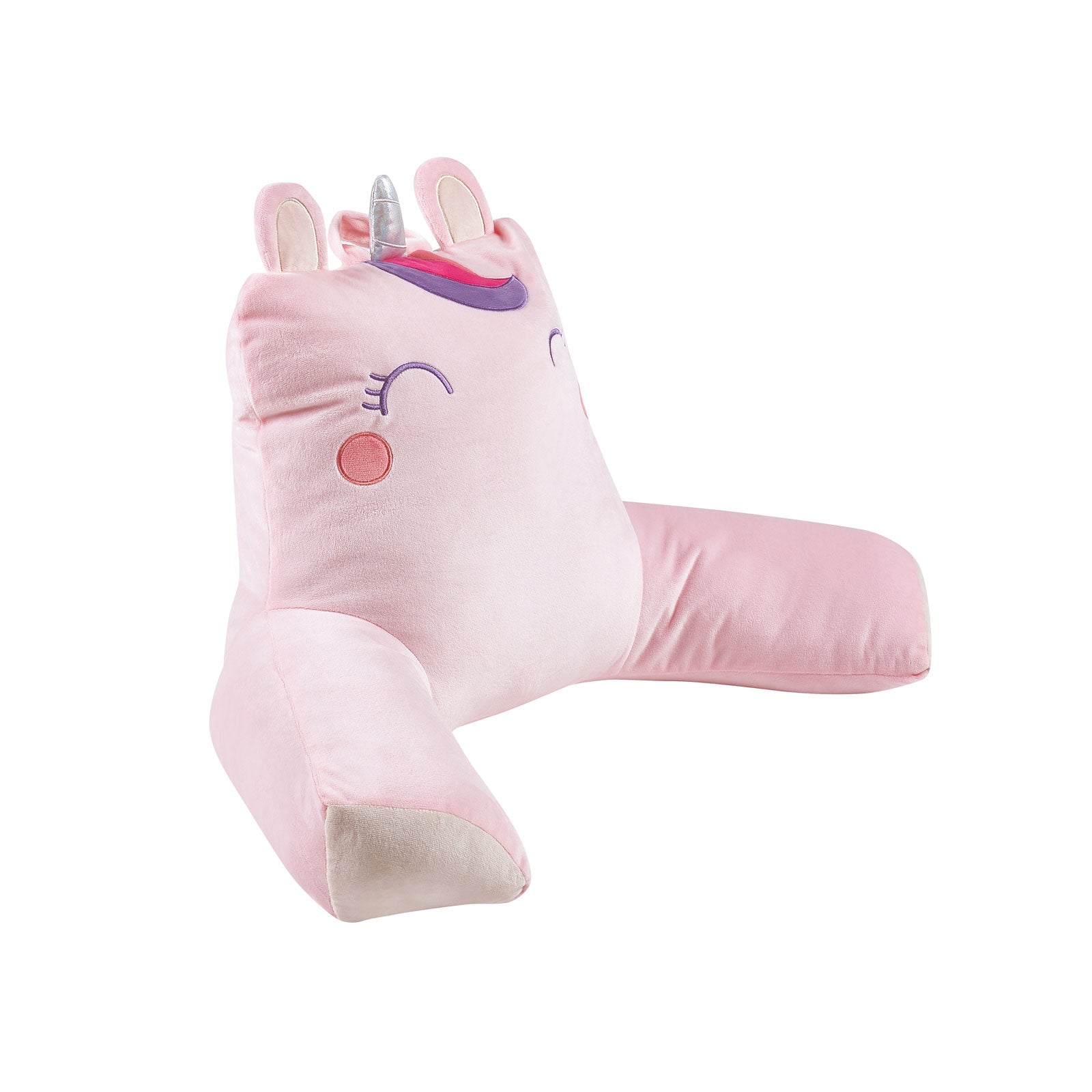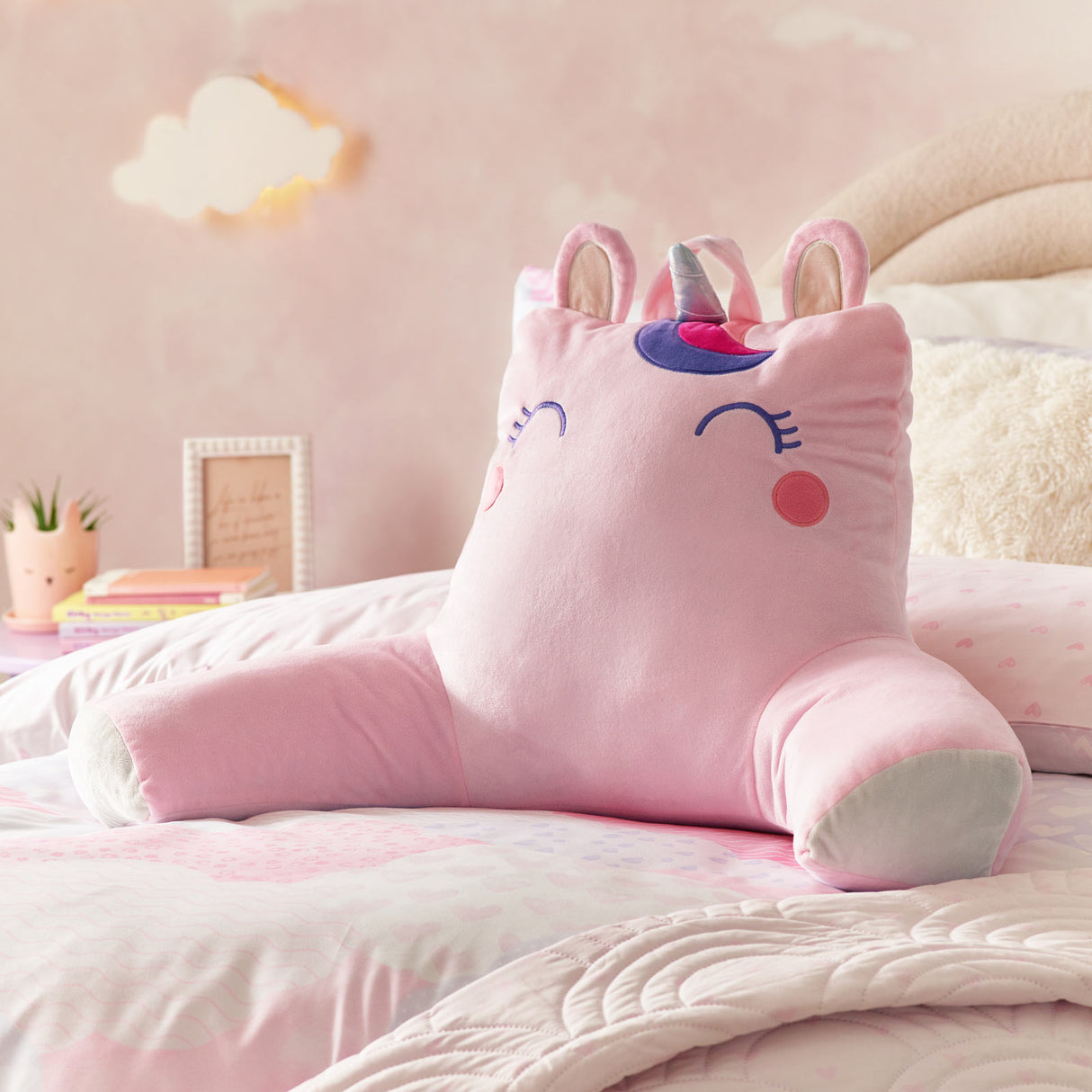 Turn your child's room into a mystical wonderland with this unicorn cuddle back rest! This delightful design features a super cute unicorn face with a shiny horn and rainbow accents, making it perfect for snuggling, reading, or lounging.