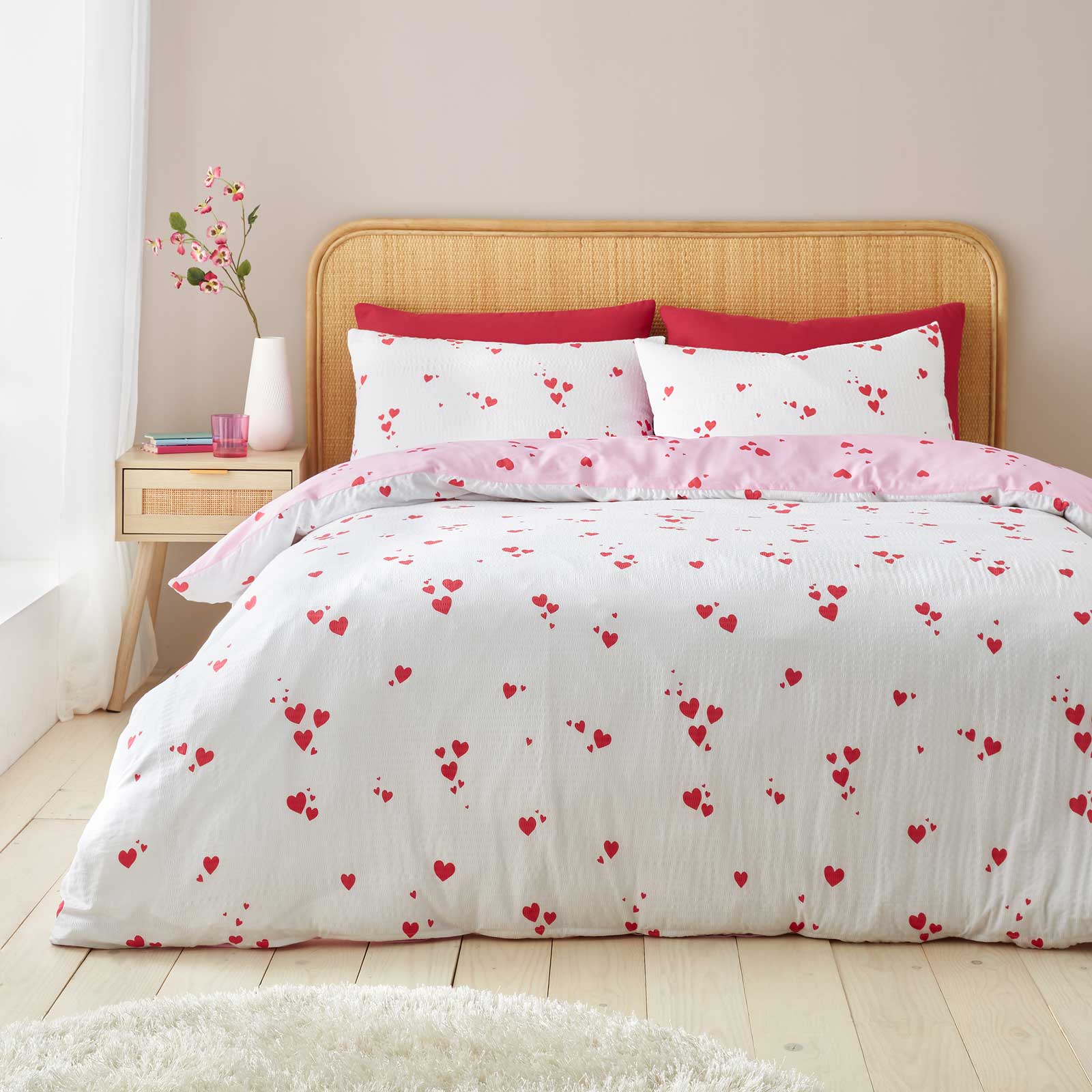 Add a touch of romance to your bedroom with this seersucker bedlinen set, featuring charming ditsy hearts on a crisp white base. Fully reversible with a contrasting delicate pink hearts design, allowing you to switch up your decor effortlessly. Created from a recycled polyester and soft cotton, blended for everyday use.
