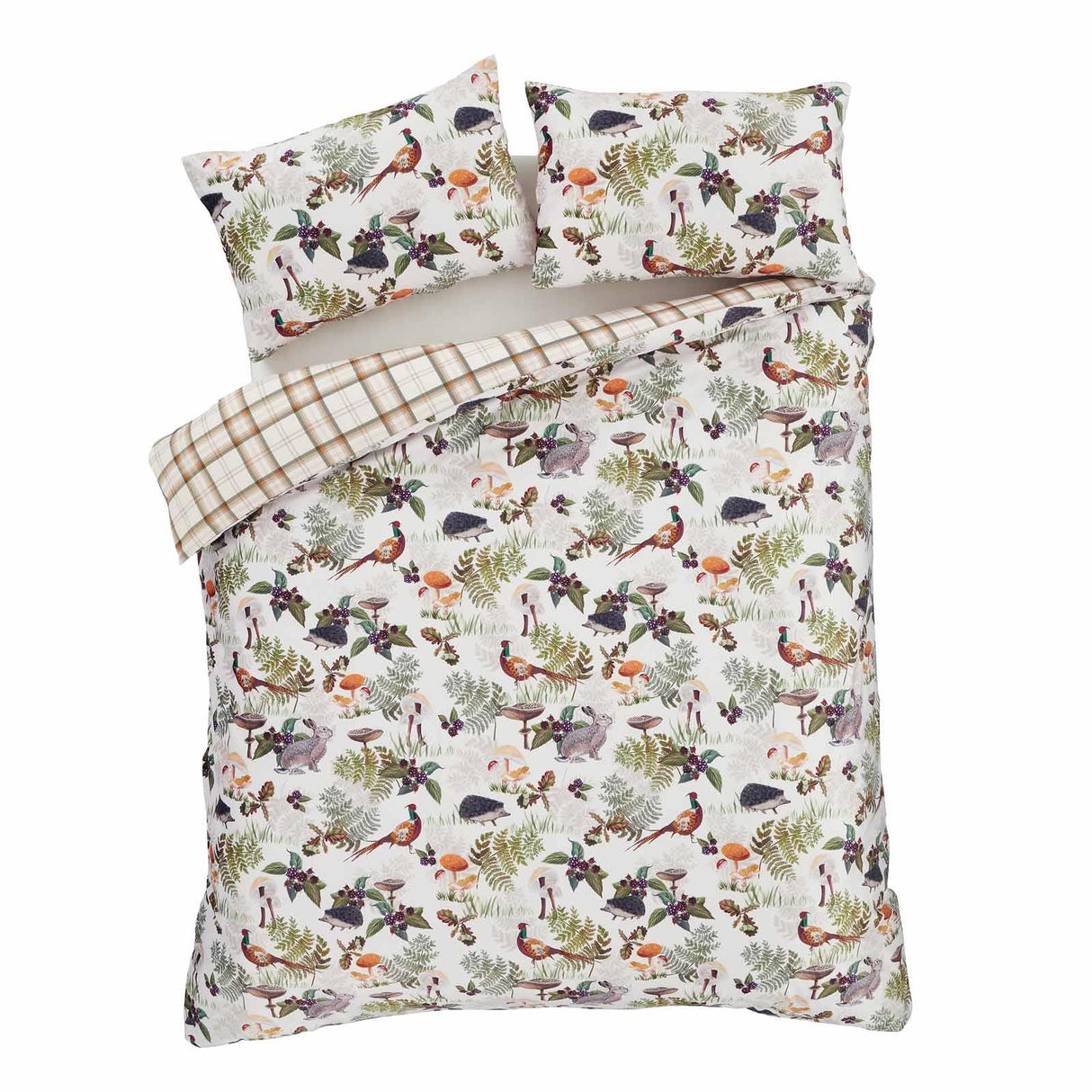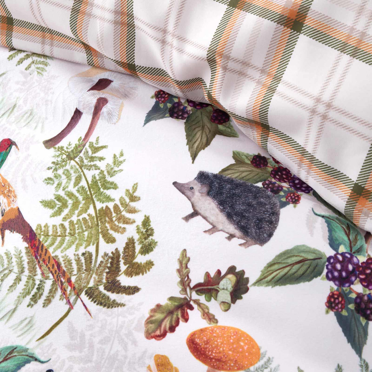 Embrace nature's tranquillity with this woodland inspired bedding set. Capturing the serene spirit of a gentle stroll through the woods, with forest wildlife and flora set against a soft, soothing backdrop. The luxurious soft touch velvet base provides a canvas for the rich, earthy tones and the vibrant wildlife motifs that adorn this enchanting bedding set. Fully reversible with a rustic check in complementary tones.