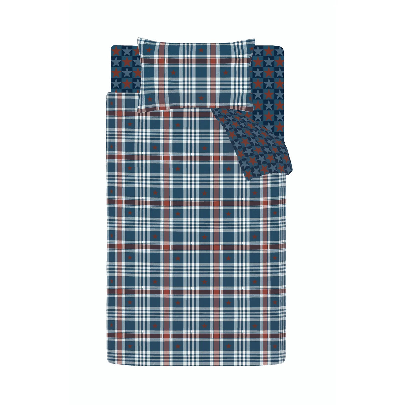 Bring a bold, adventurous fun to bedtime with this striking bedlinen set, featuring a classic check design in deep navy, brick red, and white tones, scattered with playful stars for a fun twist. The fully reversible style flips to a contrasting star print on a navy base, offering two looks in one. Created from easy-care recycled polyester and soft cotton, blended for everyday use.