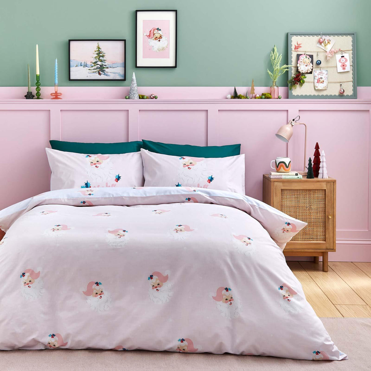 Bring the charm of retro festive styling to your home with this charming vintage Santa design, featuring a candy stripe backdrop for a super sweet touch. Switch between soft pink and light blue sides to match your mood seasonal style. Created from easy-care recycled polyester and soft responsibly sourced cotton, perfect for everyday use during the holiday season.