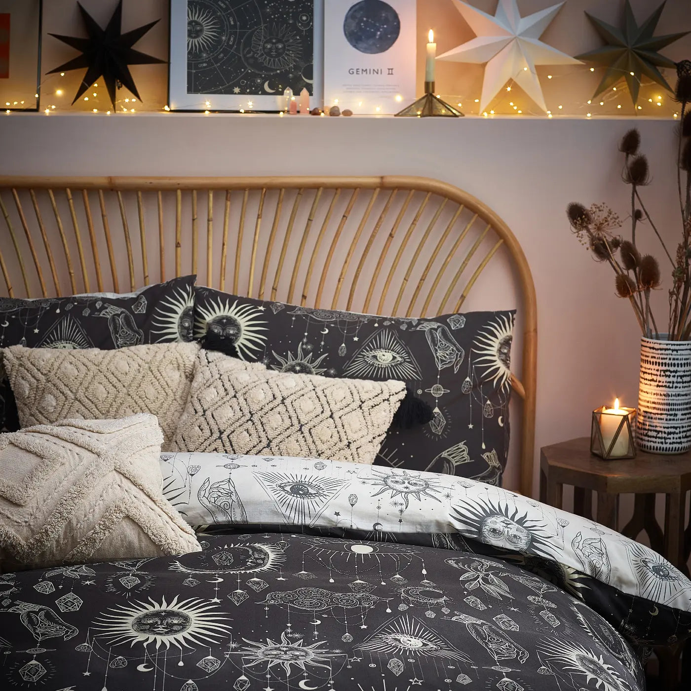 Bring a touch of magic to your bedroom with this mystical constellation duvet cover set! It features a vibrant galaxy print with moons and stars surrounding enchanting jewels. The magic continues on the reverse with a coordinating design on a neutral base, allowing you to easily switch up your look. Made from crisp yet soft and hard-wearing polycotton, this set is both comfortable and durable, complete with clear button closure on the duvet and envelope closures on the pillowcases for easy use.