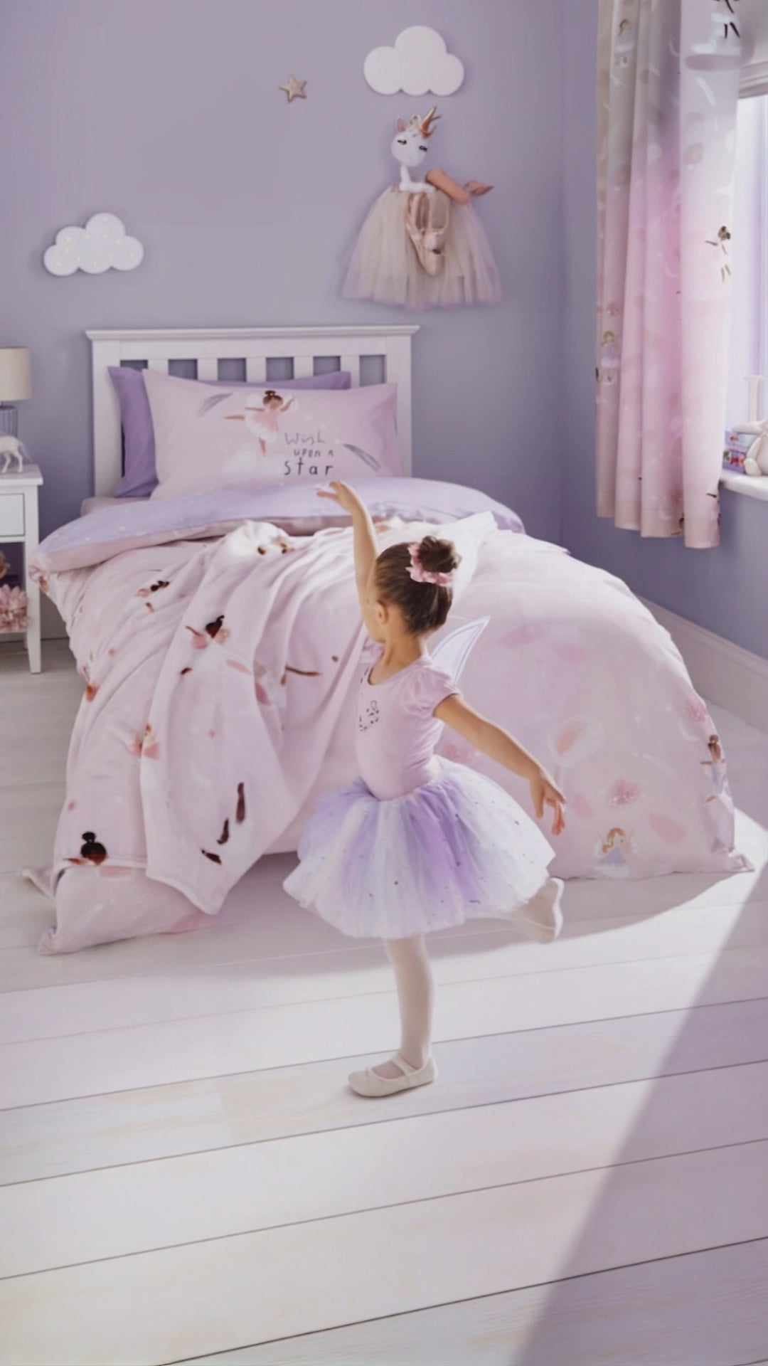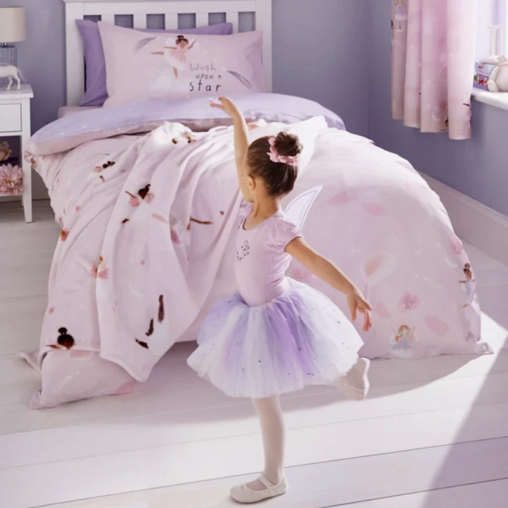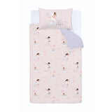 Perfect for little ones who dream of dancing amongst the stars. This beautiful design features delicate ballerina fairies, gracefully pirouetting on a pretty pink base. The set is fully reversible, with twinkling stars on a contrasting lilac base, giving you two magical looks in one. Created from easy-care recycled polyester and soft responsibly sourced cotton, blended together for everyday use.