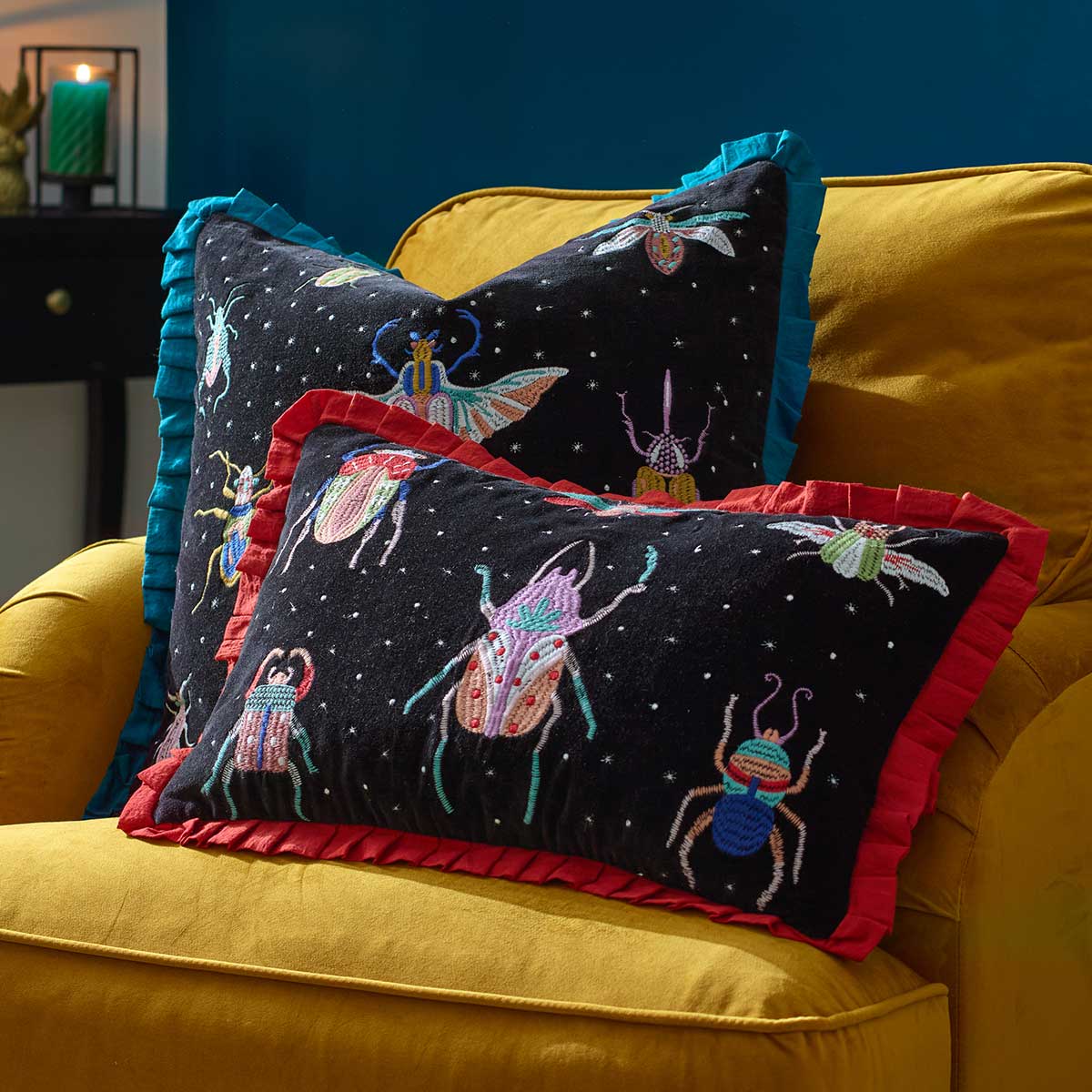 Elevate your home décor with the enchanting Darkling Beetles cushion, a stunning piece that introduces a whimsical touch to your living space. This exquisite cushion showcases a vibrant array of embroidered insects, each adorned with intricate, colourful details that capture the imagination. The celestial theme is beautifully complemented by fine starry accents, creating a captivating visual experience that is sure to spark conversation.