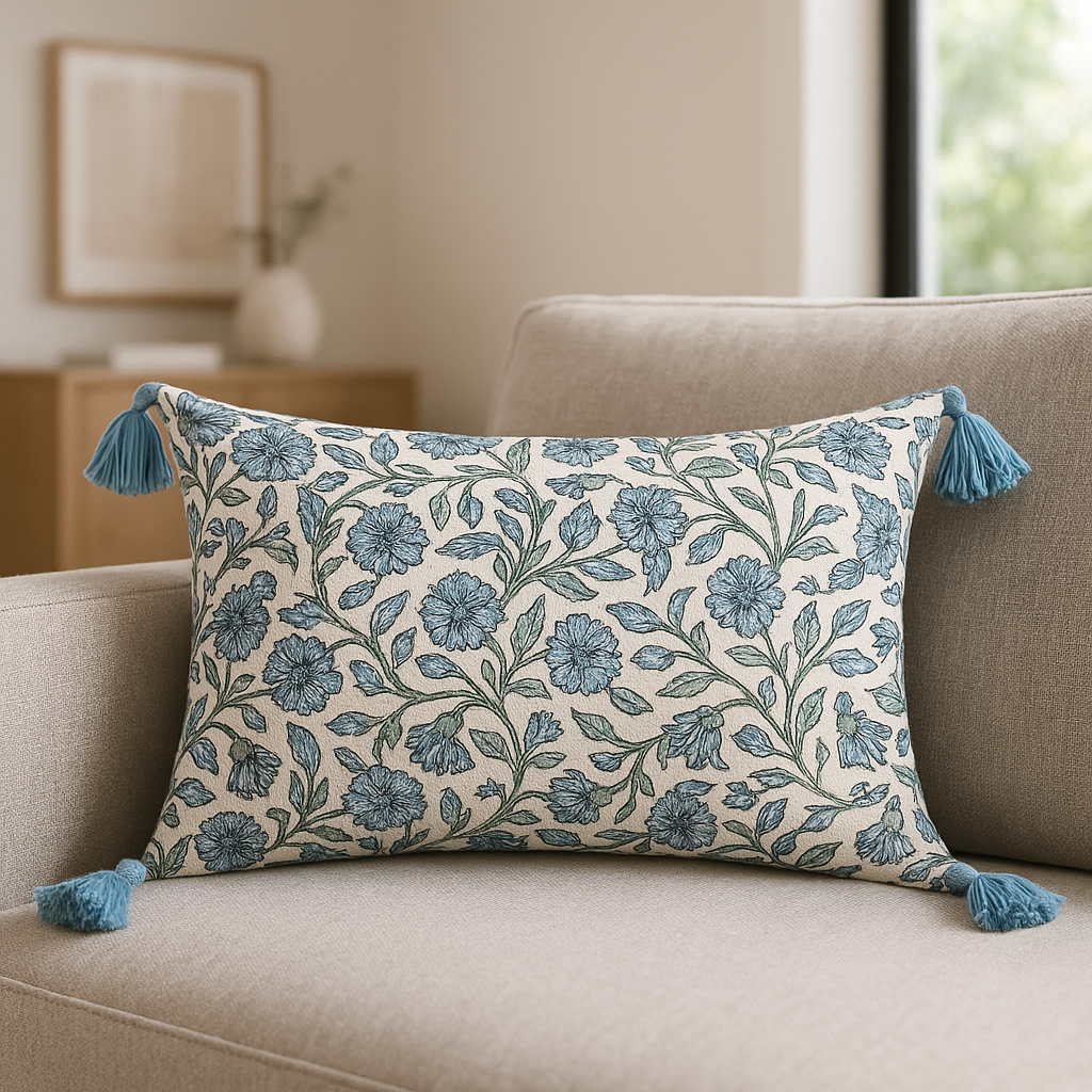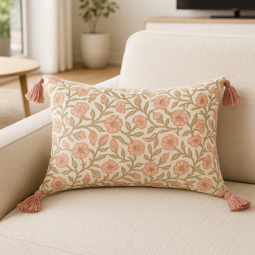 Elevate your living space with the stunning Delphine cushion, a true embodiment of elegance and comfort. Adorned with a timeless floral pattern that dances across a contemporary slub cotton base, this cushion effortlessly combines classic charm with modern aesthetics. The reverse side features a luxuriously soft plain cotton finish, ensuring that every angle of this cushion is as inviting as the front. The coordinating tasselled trim adds a playful yet sophisticated touch, making it an ideal accessory for layering in any interior setting.