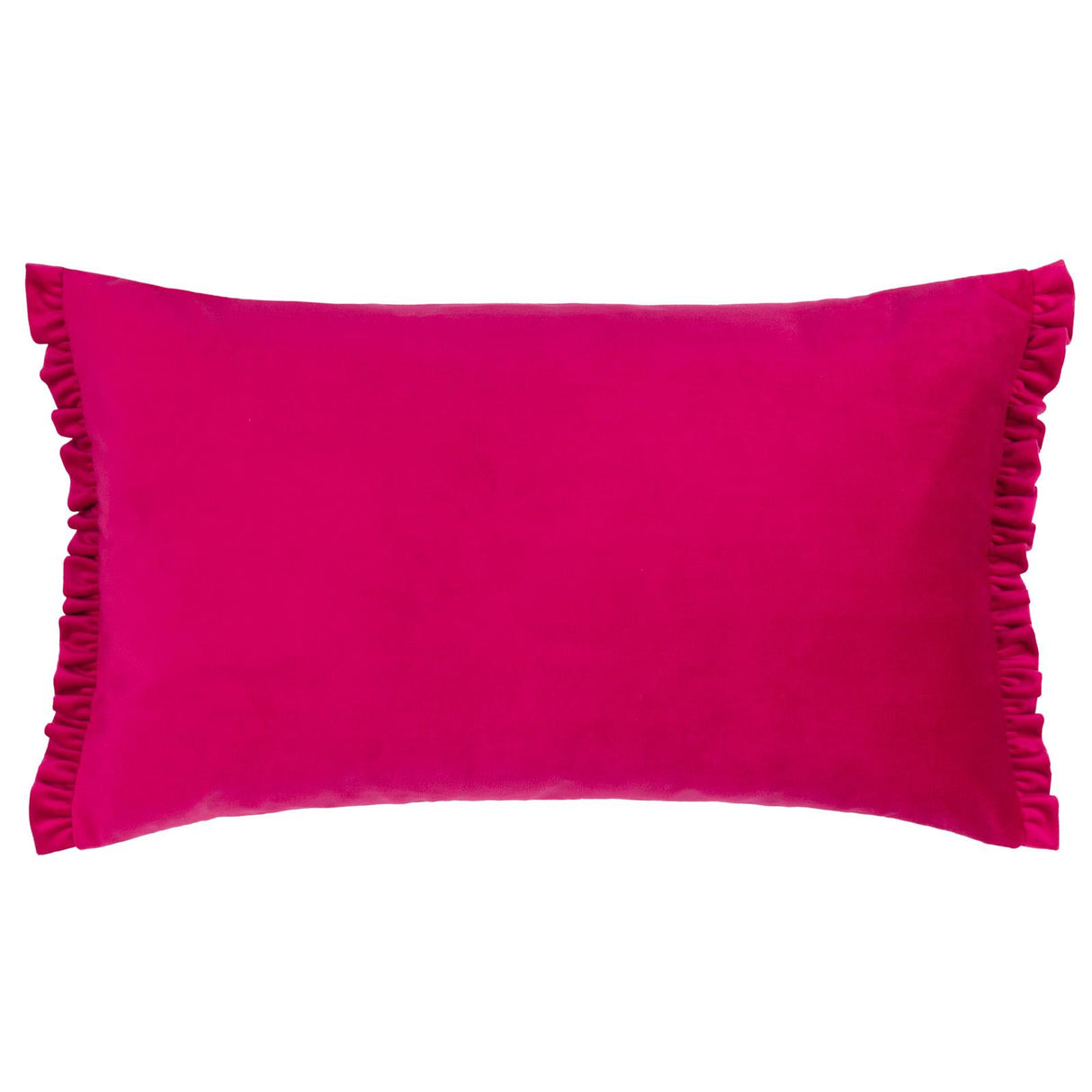 • Complete with a plain velvet reverse, pleated frill trim, and hidden zip closure