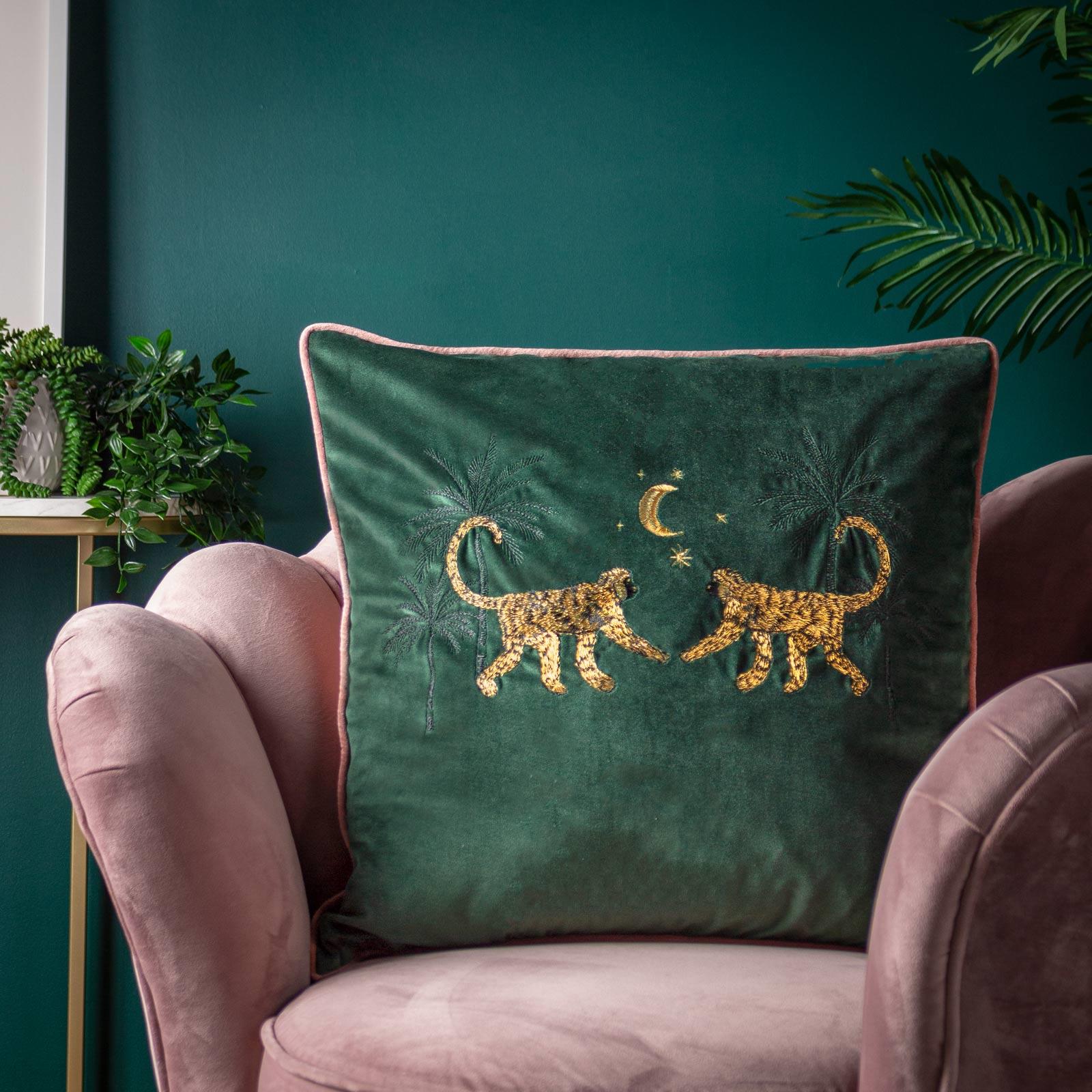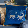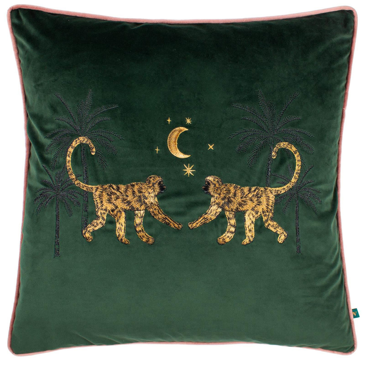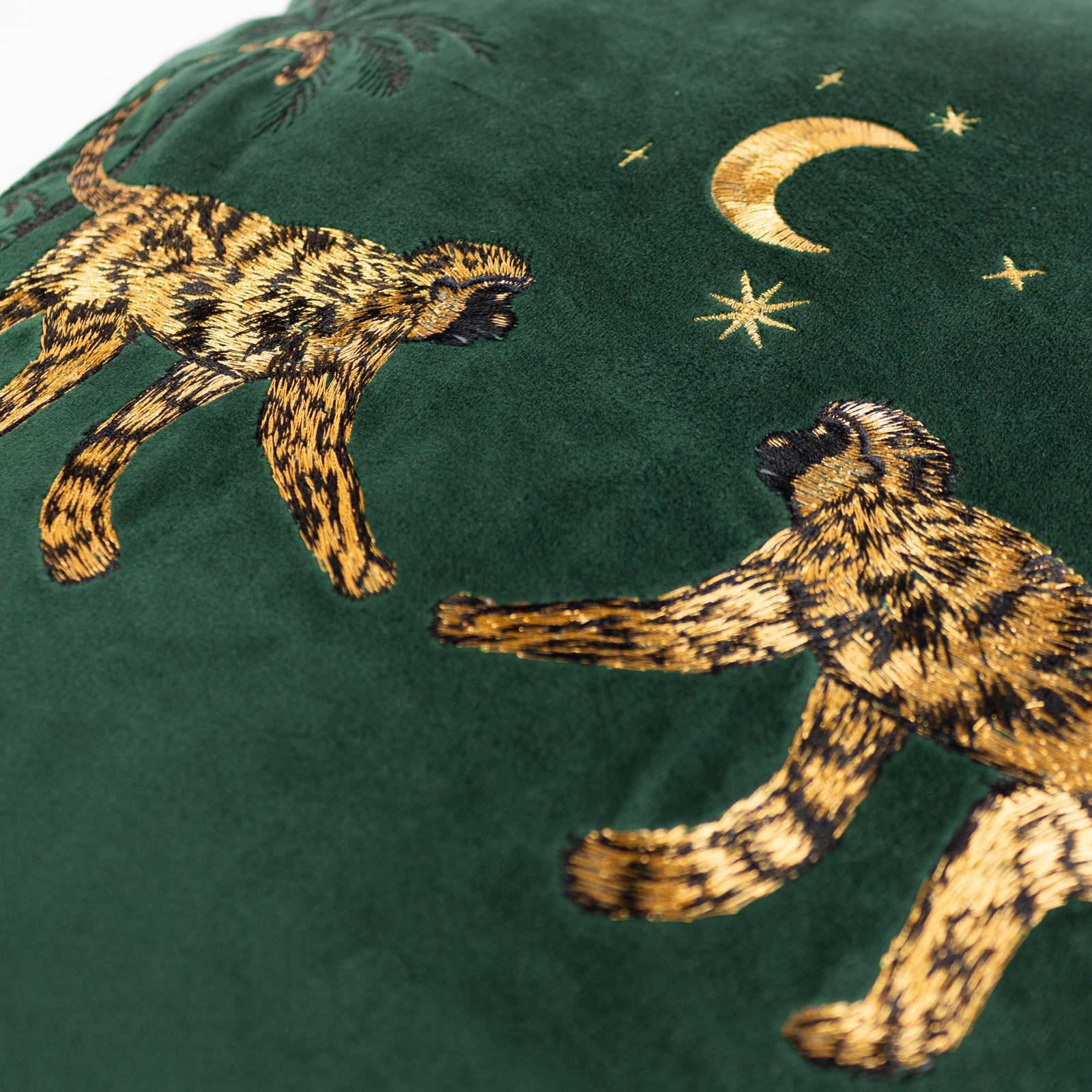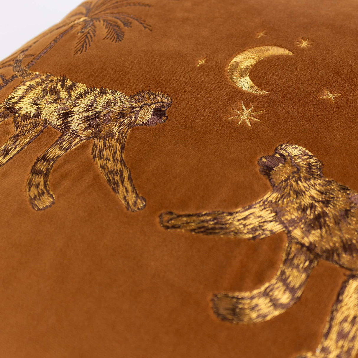 Embrace the charm of the exotic with this beautifully designed cushion cover, featuring two intricately embroidered monkeys playfully scampering among desert foliage under a starlit sky. Crafted from luxurious velvet, this eye-catching piece is adorned with a solid contrast piped trim, a hidden zip fastening, and a plain velvet reverse, making it a perfect addition to your home décor.
