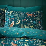 Create wonder and enchantment in your bedroom with this folklore style bed linen. Featuring delightful illustrations of woodland creatures such as foxes, owls, and rabbits, this bedding set adds an element of charm and whimsy to your room. Its fully reversible design showcases a star and feather pattern in a lighter tone, providing an effortless backdrop that complements various décor styles. Crafted from easy-care recycled polyester and soft, responsibly sourced cotton, this bedding is designed for everyday use while promoting a more sustainable choice.