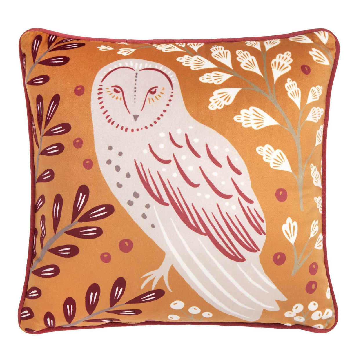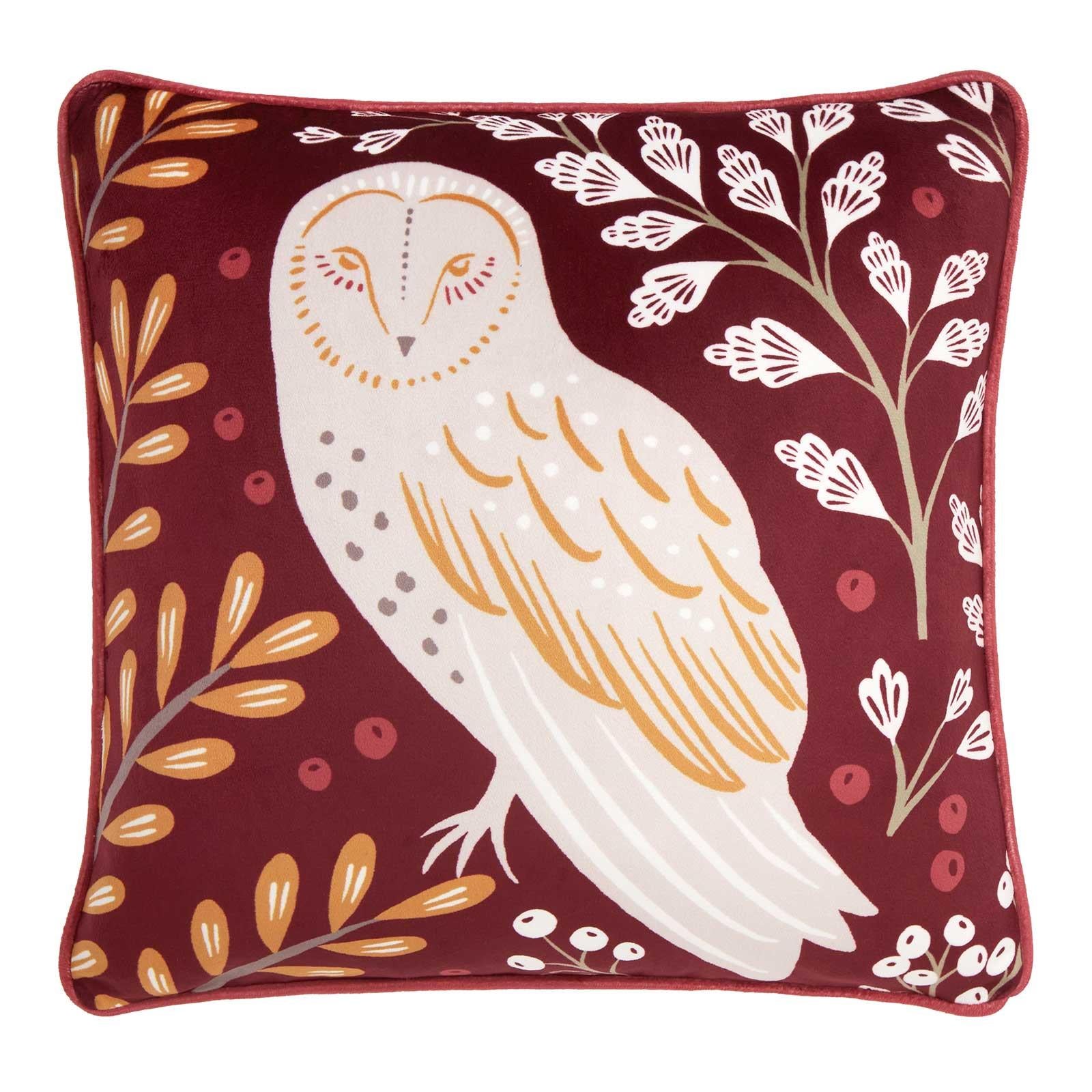 Discover the captivating charm of our Enchanted cushion cover. Gaze upon the majestic owl perched amidst a woodland shrubbery, taking centre stage against a sumptuous red velvet backdrop. Allow yourself to be swept away by the richness of the colours and textures, as you sink into a haven of comfort and warmth. But that's not all - the cushion features a matching yellow velvet reverse with luxurious piped edges, adding a touch of traditional elegance to your space. Let this magical cushion transport you to a world of enchantment, where comfort and beauty merge seamlessly.