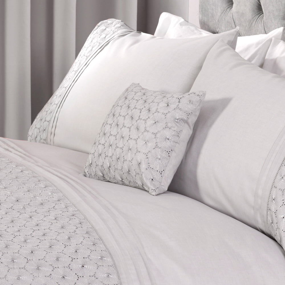 Elevate your home décor with this exquisite boudoir cushion, designed to bring a touch of vintage charm to any space. Featuring delicate broderie anglaise lace and intricate pin-tuck detailing, this cushion is the perfect complement to your bedding ensemble, enhancing the overall aesthetic of your bedroom.