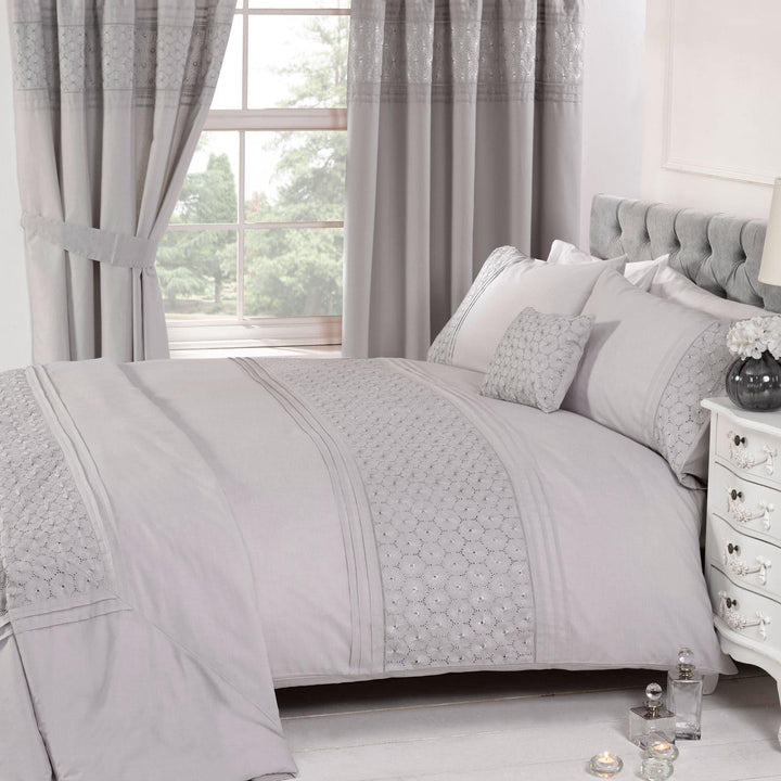Discover the elegance of the Everdean collection, a beautifully crafted range of embellished bed linen designed to elevate your bedroom décor. Each duvet cover set features exquisite embroidered circles with pintuck edging, creating a fresh and timeless aesthetic that complements any style.