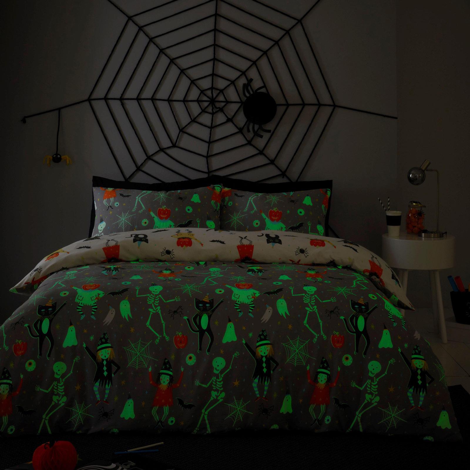 Trick or treat yourself and have a Happy Halloween with this wicked glow in the dark bedding. Printed onto an easycare cotton rich blended fabric, this duvet set will ensure you have a spooky bedtime.