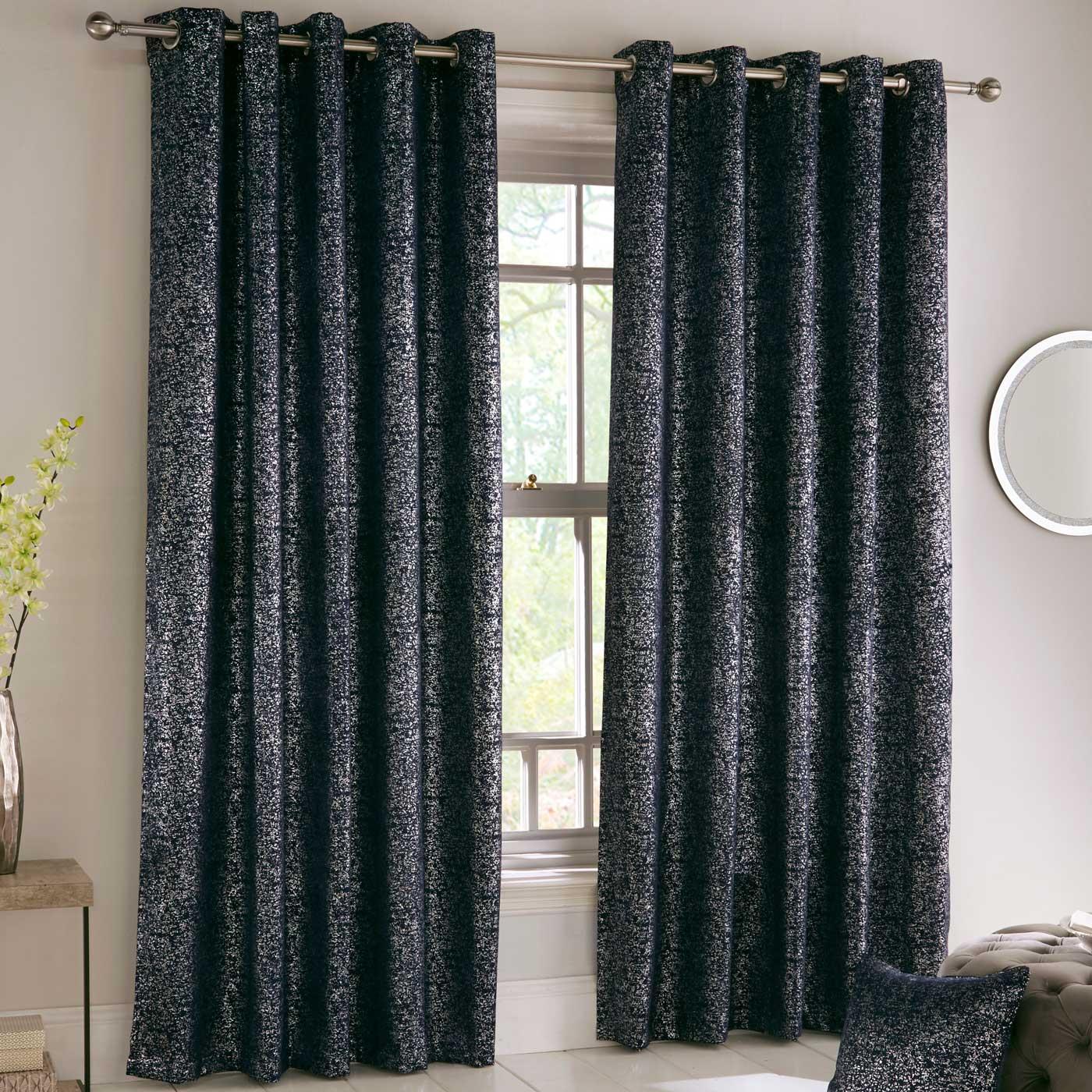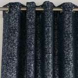 Stunning navy blue Halo eyelet curtains with an all-over silver metallic sparkle detailing. These curtain pairs will block out the majority of sunlight and UV rays thanks to their innovative triple layer technology and also have thermal and noise reducing qualities keeping your home warm in winter, help save energy and lower your bills. These lined curtains are fitted with an eyelet ring top heading for use on a curtain pole.