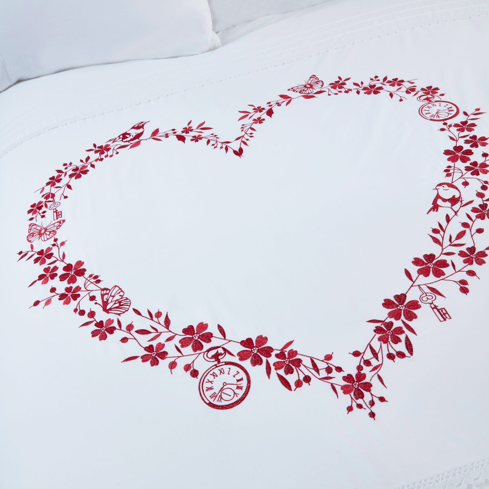 Transform your bedroom with our Heart Duvet Cover Set, crafted from a blend of 50% cotton and 50% polyester for a soft and durable finish. This machine washable set is designed for easy care, with a maximum wash temperature of 40C and suitable for tumble drying on low heat. The beautiful heart embroidery showcases intricate details including birds, pocket watches, butterflies, and keys, adding a whimsical touch to your decor. Finished with delicate crochet lace and pintucks, this pretty bed set features a convenient button closing mechanism for a polished look. Elevate your sleeping space with this charming and stylish duvet cover set.
