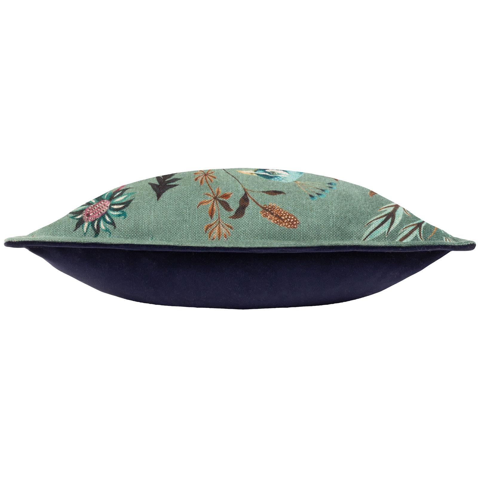 Inspired by British country gardens, this cushion cover adds a touch of charm to your soft furnishings. Printed on textured linen feel fabric, a hand painted peacock poses proudly amongst the inky decorative foliage. Set against a cool teal blue background, this cushion is complete with a luxurious navy velvet reverse and Oxford edge trim.
