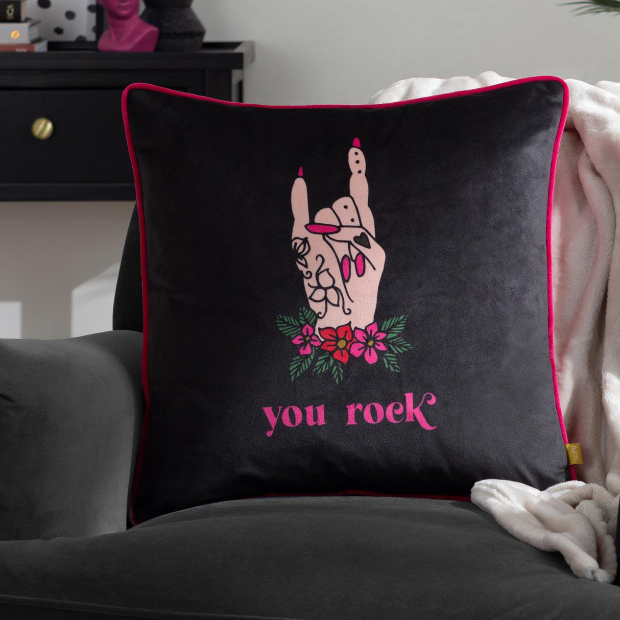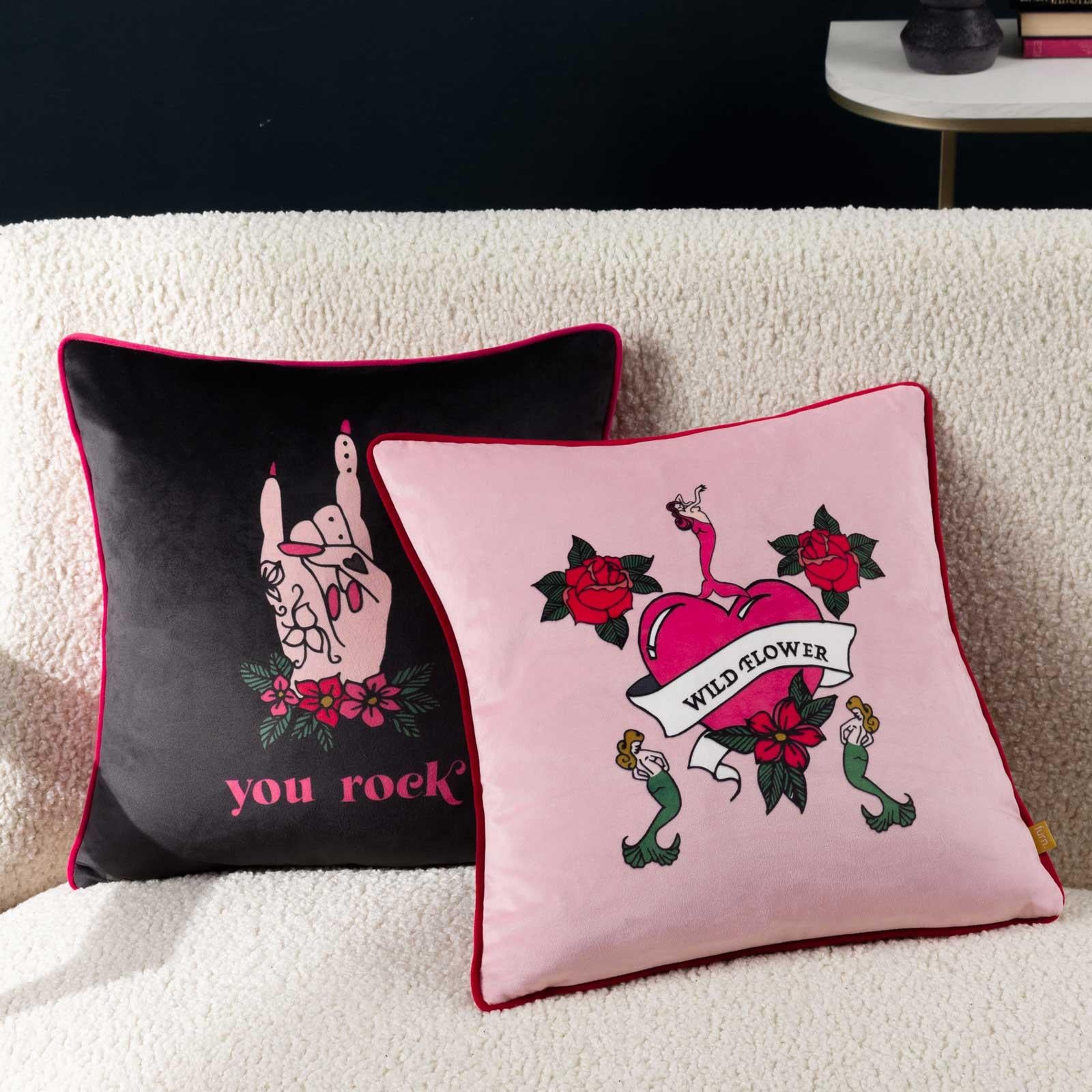If this cushion cover is on your couch, you seriously rock! Printed on soft velvet and featuring the sign of the horns with flowers, this piece hits the right notes for rock gods and goddesses everywhere. Inspired by tattoos, vintage retro glamour and just great music, the Inked You Rock cushion is the ideal choice for those who were born to be wild.
