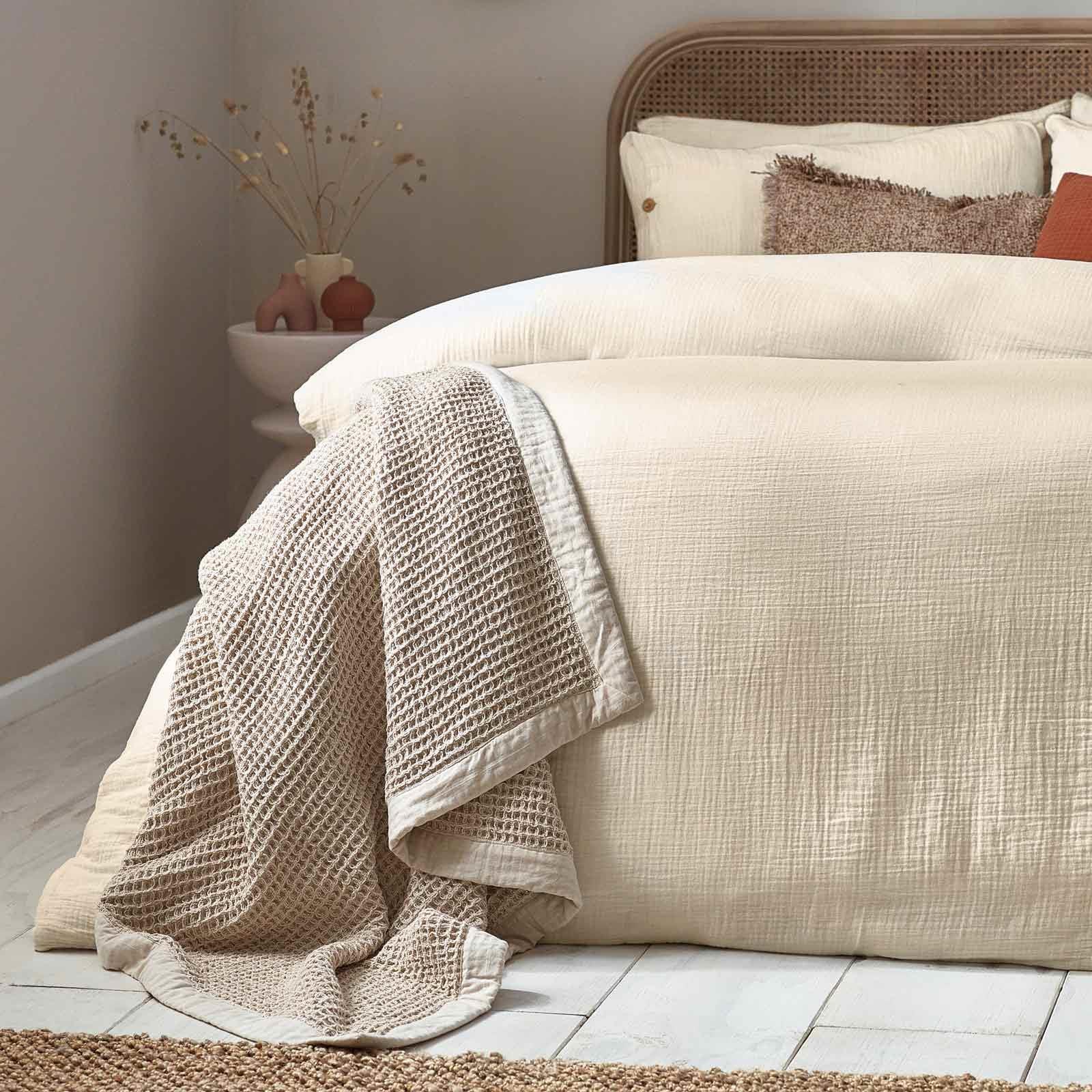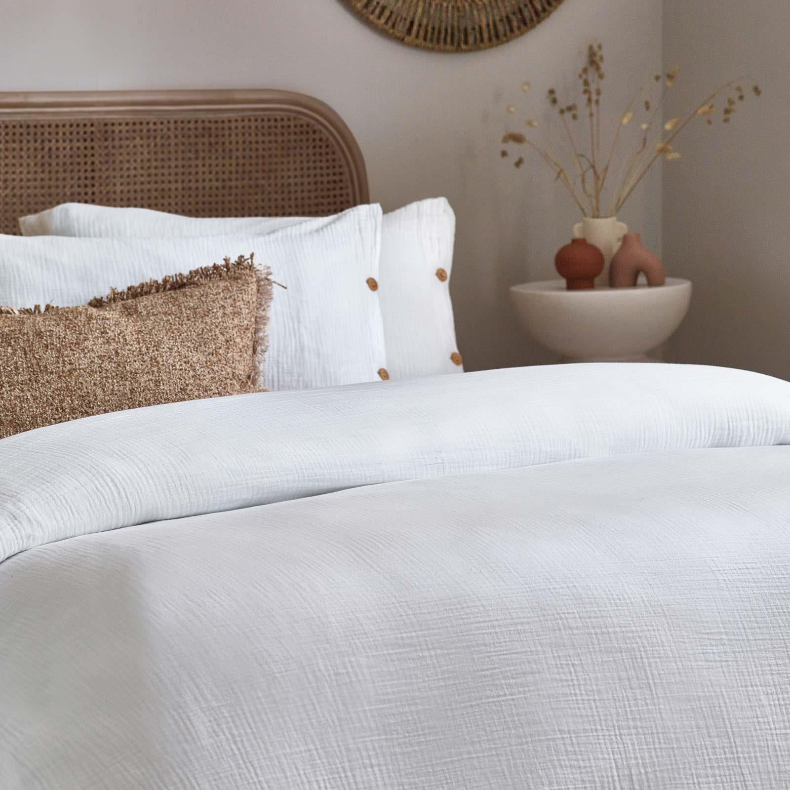 Transform your bedroom into a serene sanctuary with this ultra-soft duvet cover set, crafted from double-layer muslin cotton fabric. Inspired by timeless classic fabrics, this bedding collection is available in a variety of soothing pastel tones, perfect for creating a relaxed, stylish atmosphere. The unique crinkle texture not only adds visual interest but also enhances comfort, making it a delightful choice for any season. Cool and breathable during the summer months and cosy and warm in winter, this duvet cover set features muslin on both sides for a modern yet understated look. Plus, it is certified by OEKO-TEX®, ensuring it has been sustainably made for your peace of mind.