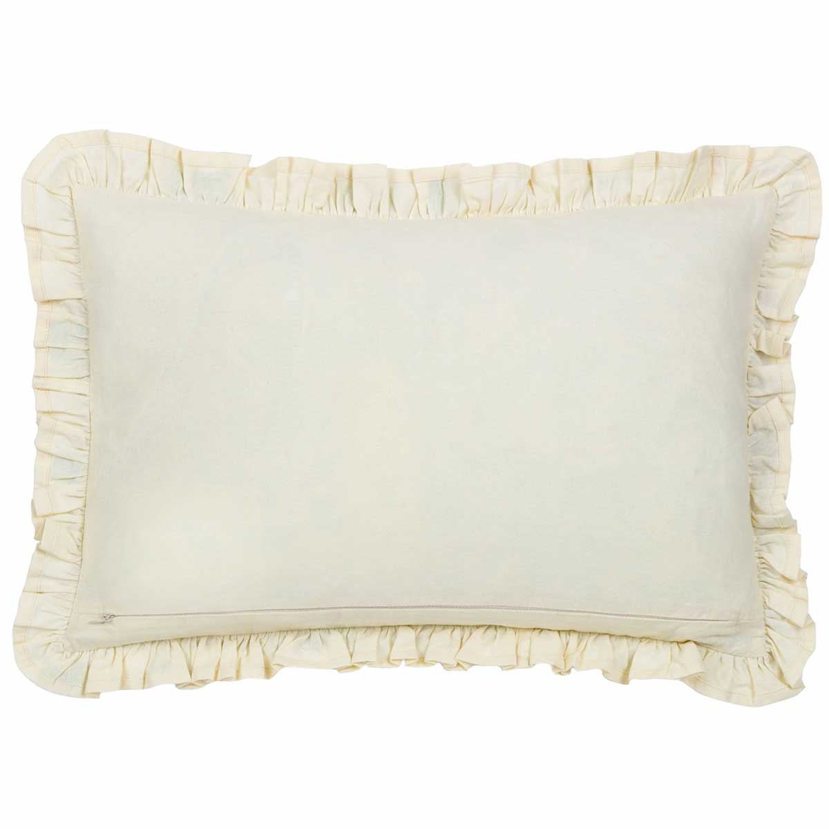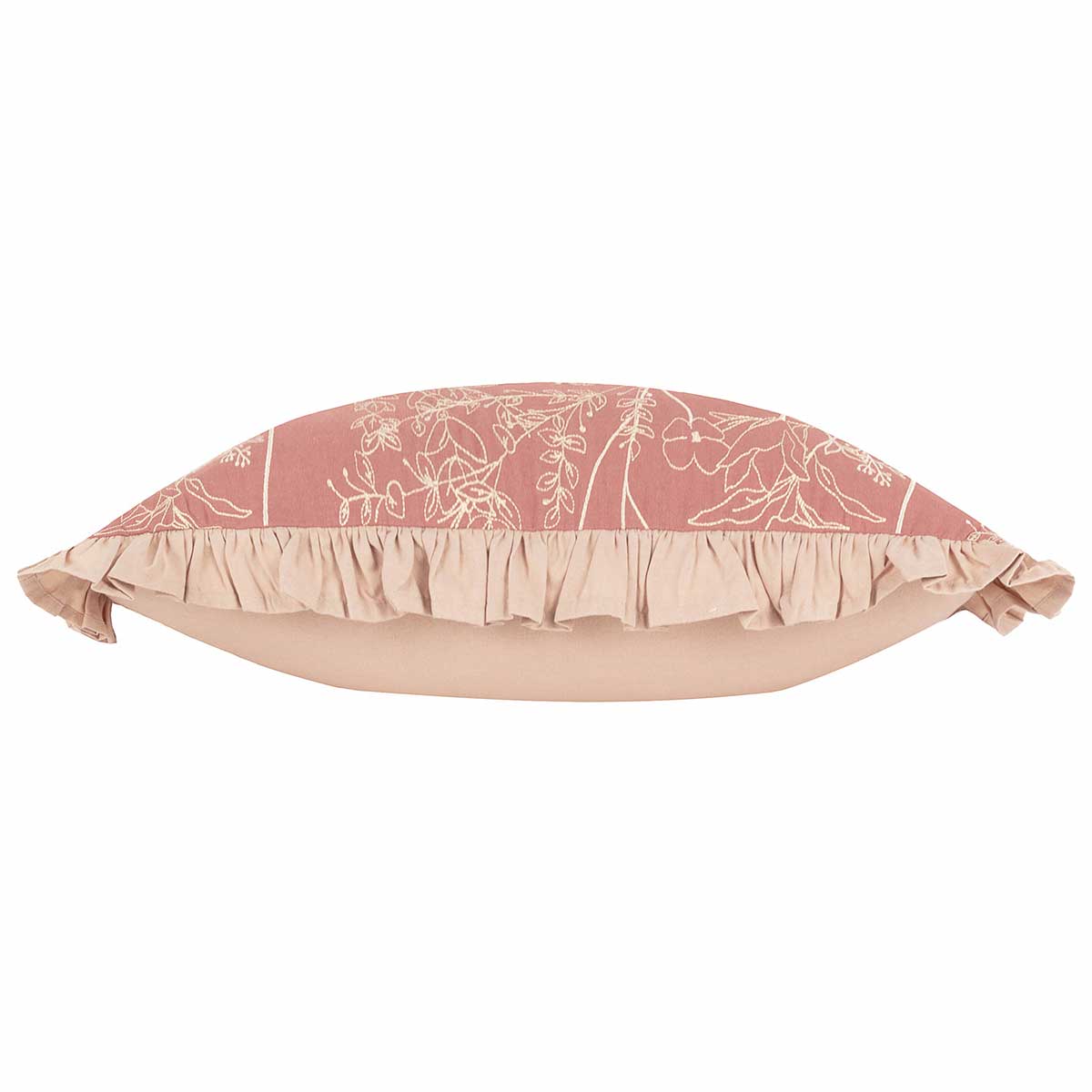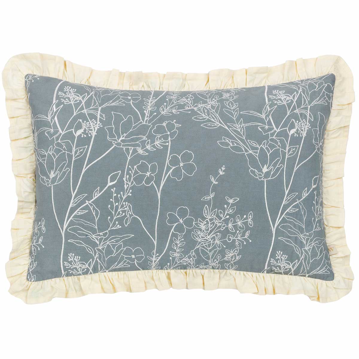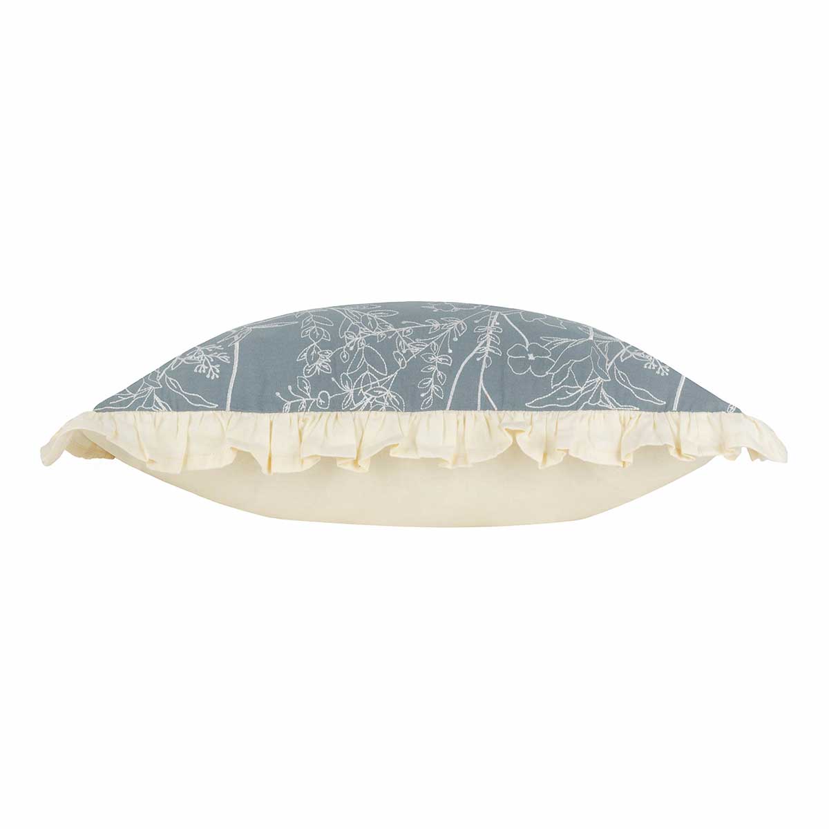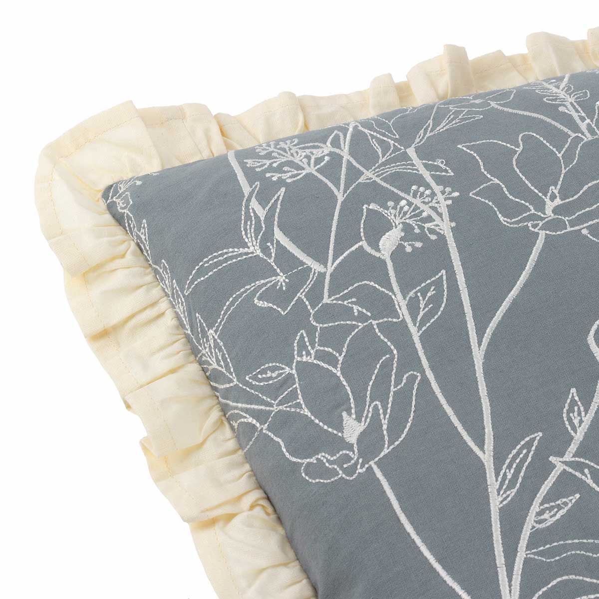 Introducing the Mae cushion, a delightful addition to your home décor that effortlessly combines elegance with a touch of whimsy. This cushion showcases a beautifully minimalistic floral design, intricately embroidered onto a luxuriously soft cotton fabric, ensuring both comfort and style. The reverse side is plain, providing a subtle contrast, while the charming ruffled trim adds a playful yet sophisticated detail that enhances its overall appeal.