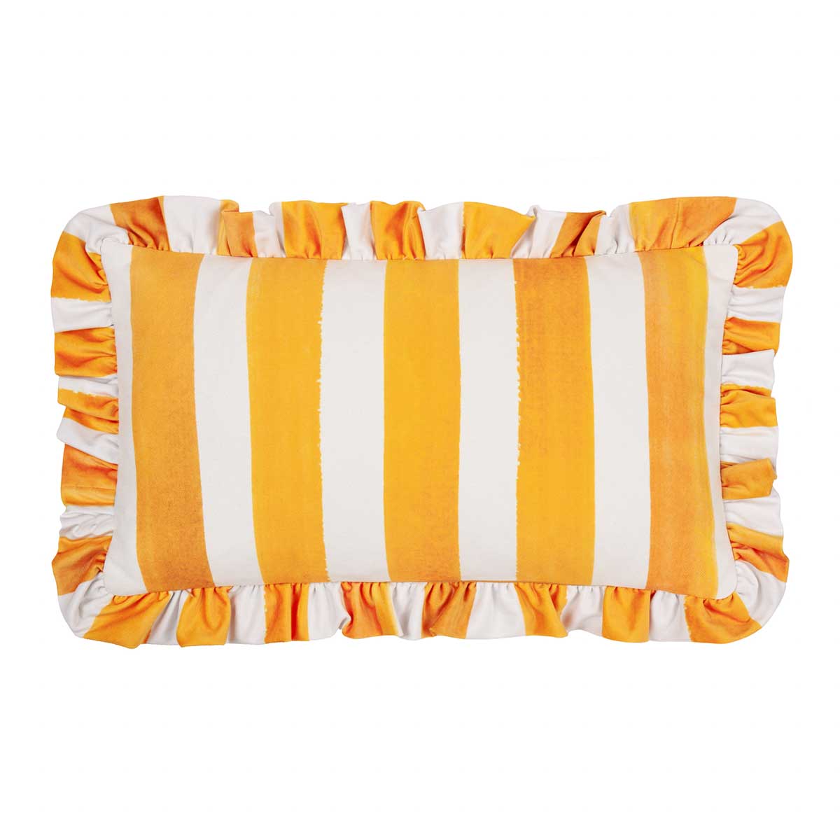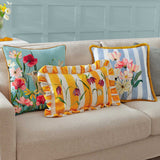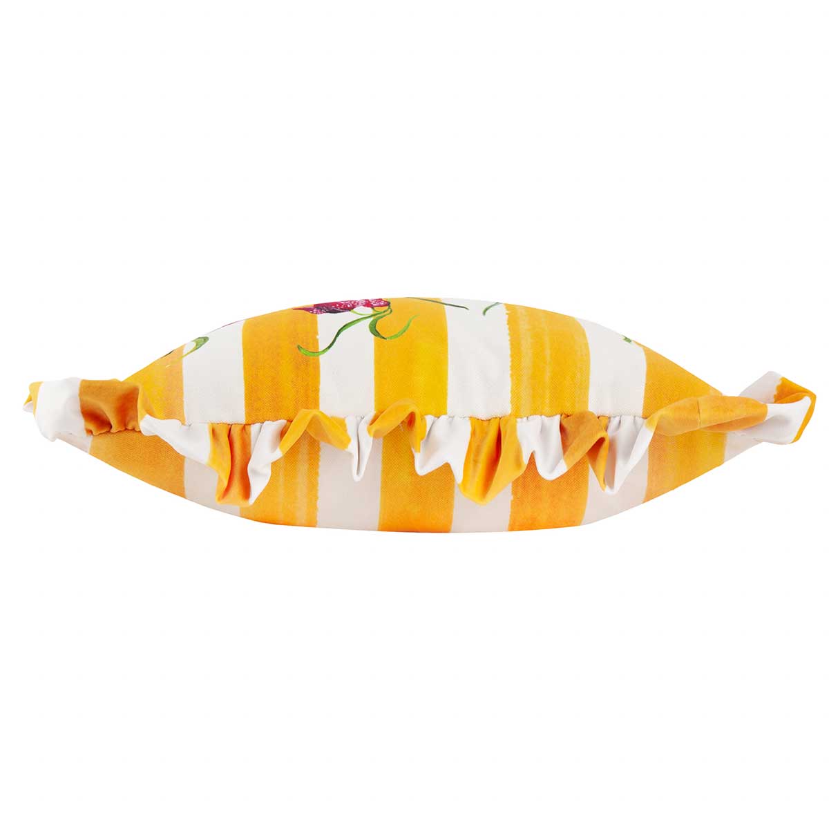 Transform your living space with the enchanting Marais Fritillaries Printed Ruffle Cushion, a stunning fusion of artistic flair and plush comfort. This exquisite cushion showcases a digitally printed, hand-painted design featuring intricate floral motifs that dance across a backdrop of bold, contrasting stripes, infusing your home with a vibrant touch of nature's beauty. Crafted from luxuriously soft chenille fabric, the cushion is adorned with a charming ruffle trim that adds both texture and a relaxed sophistication, making it a striking focal point or a delightful accent to enhance modern country aesthetics. Whether gracing your sofa or adorning your bed, this cushion effortlessly marries elegance with a playful spirit, elevating any room with its captivating presence.