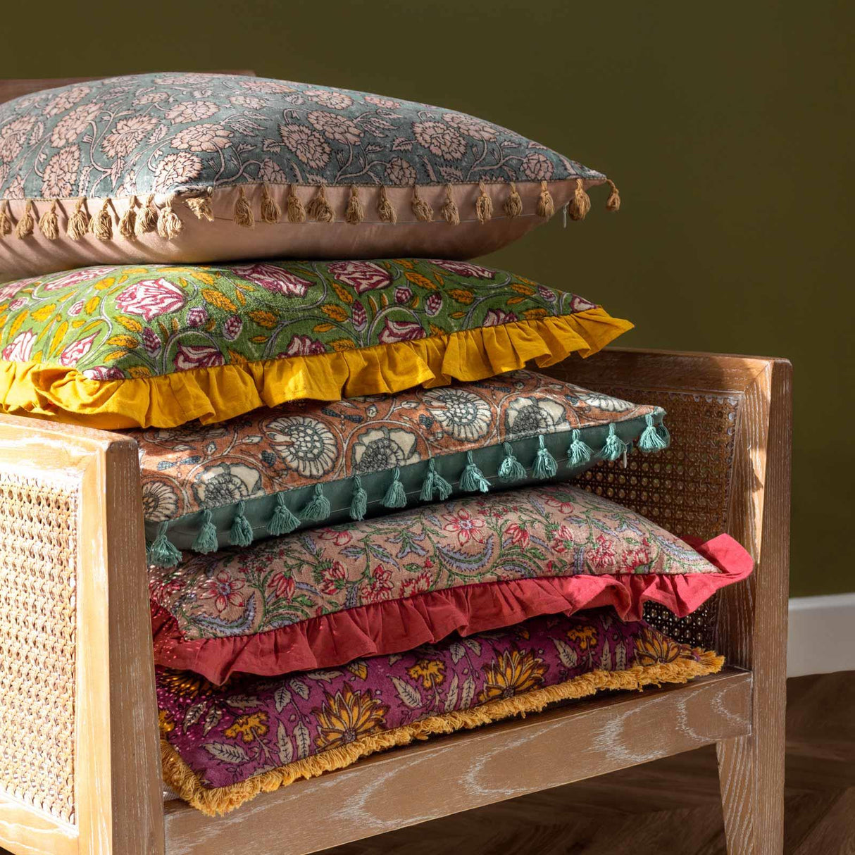 As part of our debut range for Paoletti 1973, this collection was created to celebrate 50 years of global travel to find the finest and most elegant textiles. Inspired by Indian block print patterns in muted, sophisticated tones, the Marisa cushion cover features detailed illustrations of flowers. This design is printed onto a cotton velvet fabric and finished with a mini tasselled trim for added status, making it an excellent addition to any distinguished home.