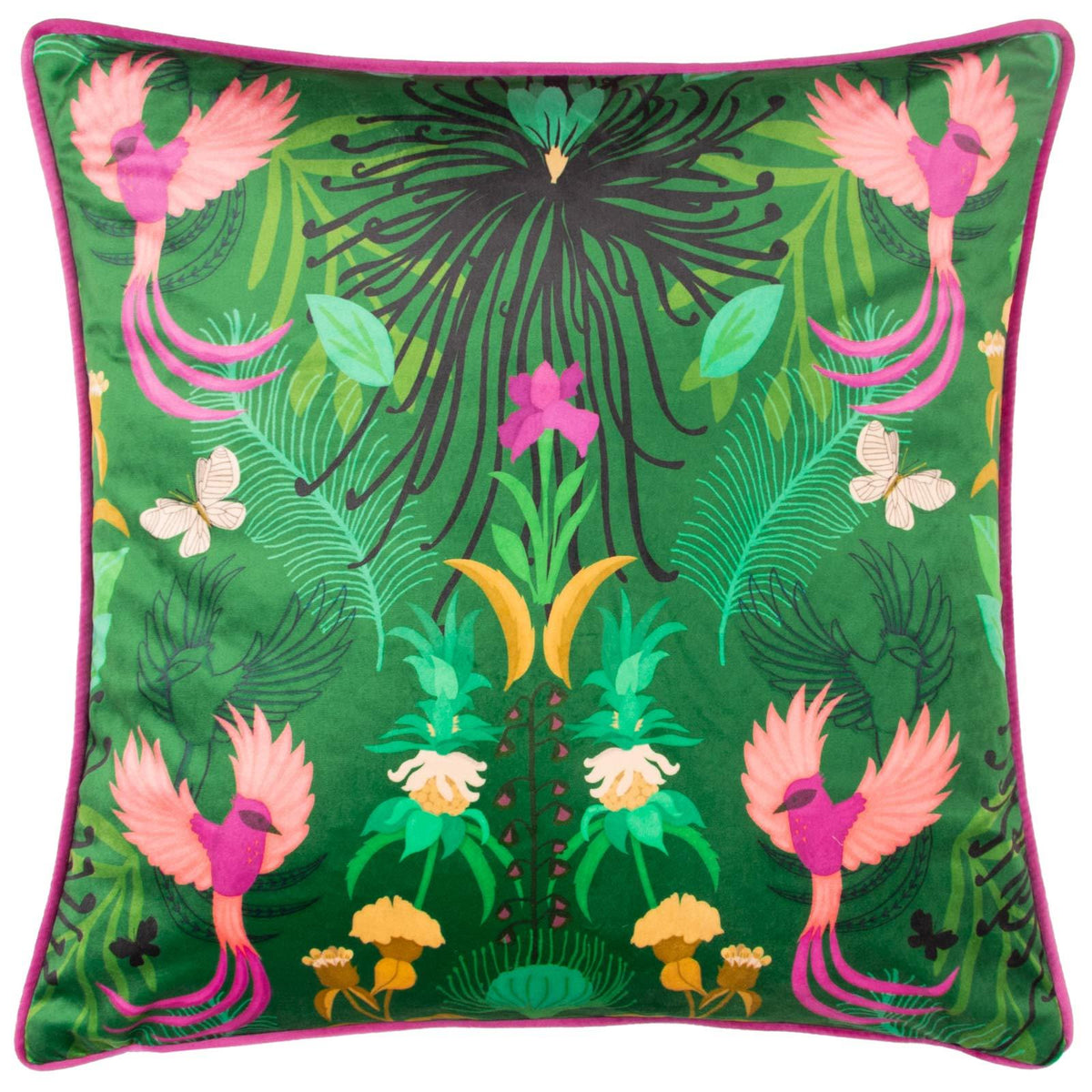 Pretty pink birds fly freely among the dense foliage of the lush rainforest on this gorgeously designed cushion cover. Printed on luxurious opulence velvet and adorned with delicately woven piping, this piece would make a fresh addition to your home.