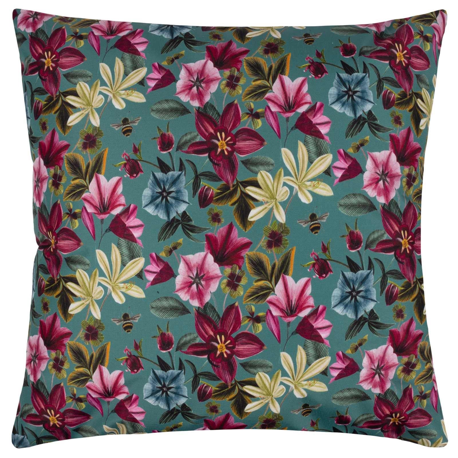 In amazing traditional hand painted, printed detail a humble bumble bee hovers motionless surrounded by bright country florals below, set on a complementing teal background. If you turn it over, the bee has flown off and a further bunch of bright blooms are revealed in vivid detail and colour, to add cheerful tones to your outdoor styling, giving you two looks in one. Whichever way round, this cushion cover adds a summery flavour to a patio, balcony or terrace.